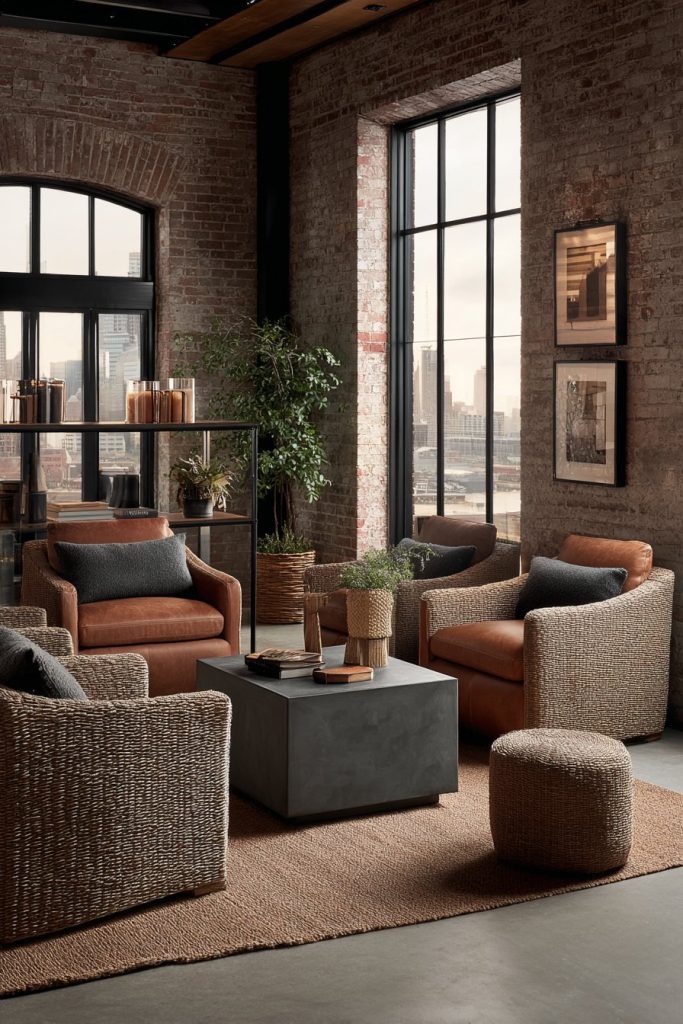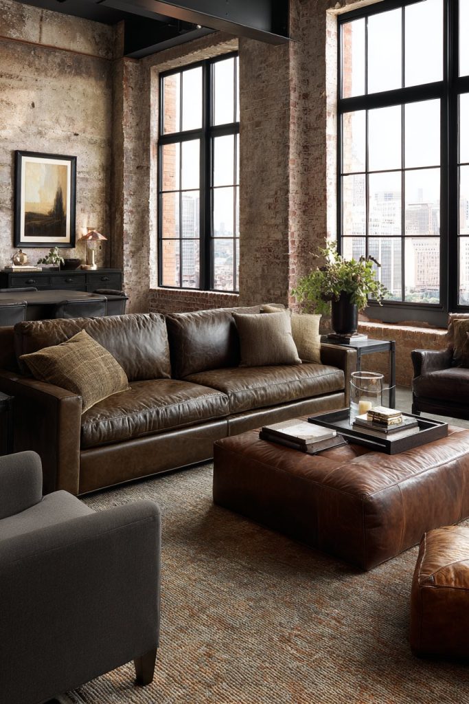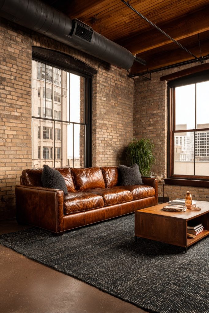 Embrace the raw beauty of urban industrial design with a distressed leather rug that demonstrates how unexpected materials and authentic wear patterns can create sophisticated comfort within industrial-inspired living spaces. This edgy design approach shows how industrial elements can be softened and humanized without losing their essential character and urban appeal.