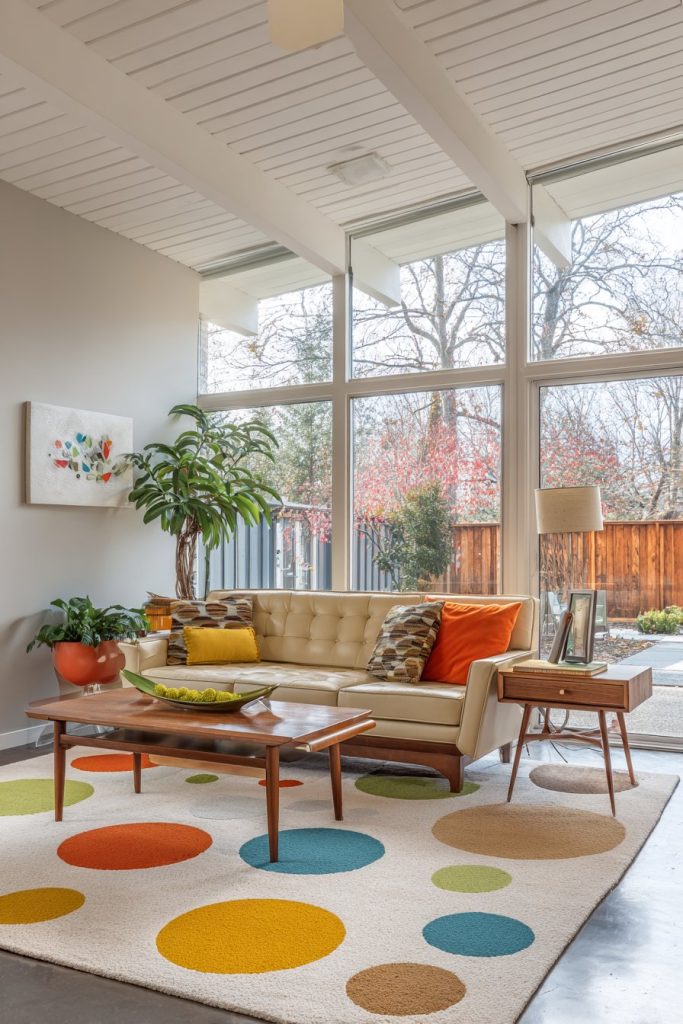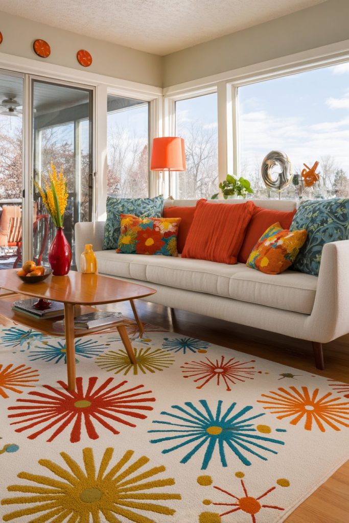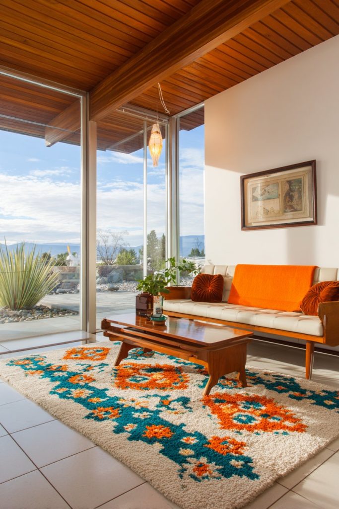 Floor-to-ceiling windows and clean architectural lines enhance the period authenticity while flooding the space with natural light that highlights the rug’s bold retro patterns and vibrant color combinations. The careful attention to period-appropriate details—furniture selection, color palette, architectural elements—creates authentic mid-century modern atmosphere. Interior design photography with period-appropriate lighting techniques highlights the rug’s bold retro pattern and vibrant color combinations while demonstrating successful integration of authentic mid-century design elements.
