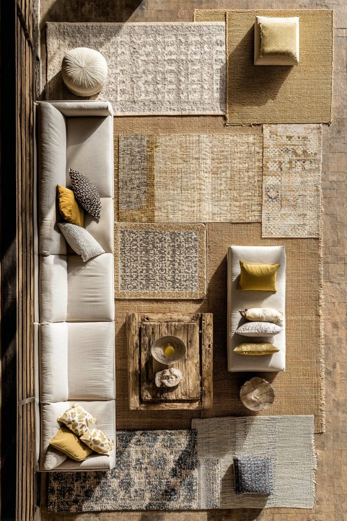 - Start with large neutral rug as foundation layer for flexibility and stability
