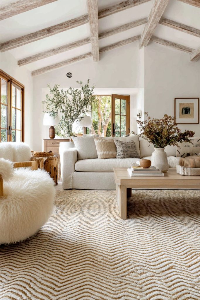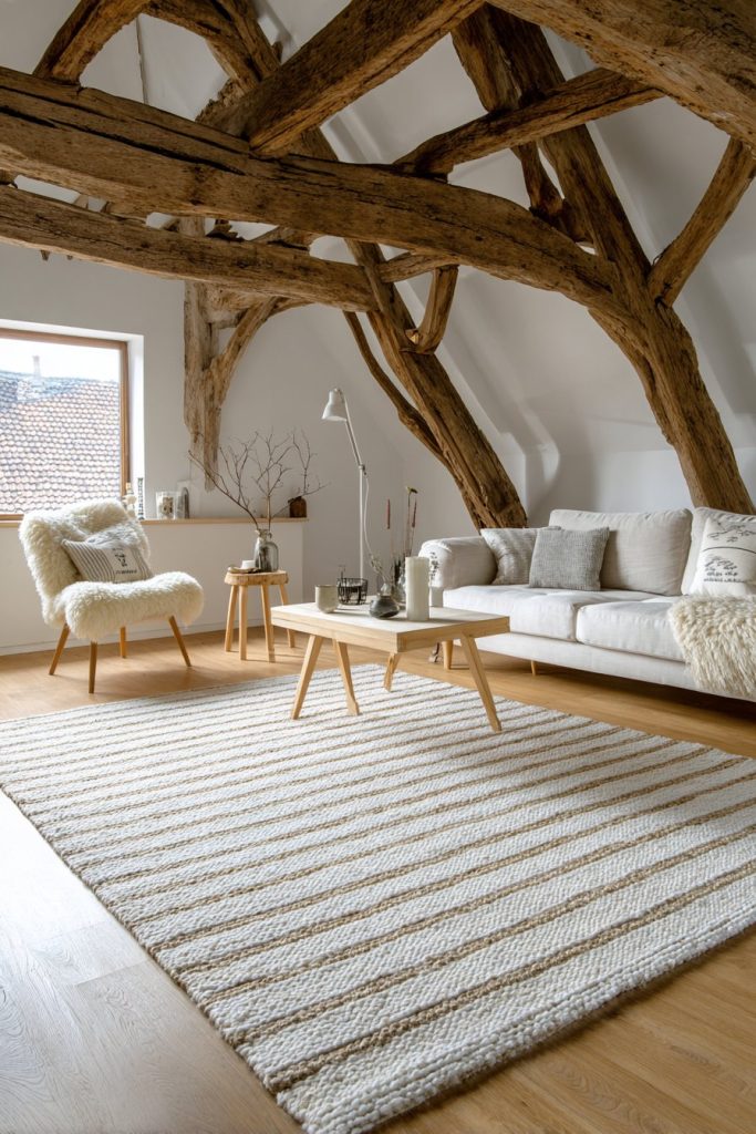 Exposed wooden beams and crisp white walls create an airy backdrop that allows the rug’s organic beauty to take center stage. The combination of different natural textures—jute, linen, sheepskin, and wood—creates a layered, tactile experience that invites relaxation and comfort. Soft diffused lighting emphasizes these organic textures and creates gentle shadows that highlight the rug’s natural weave pattern, adding depth and visual interest throughout the day.