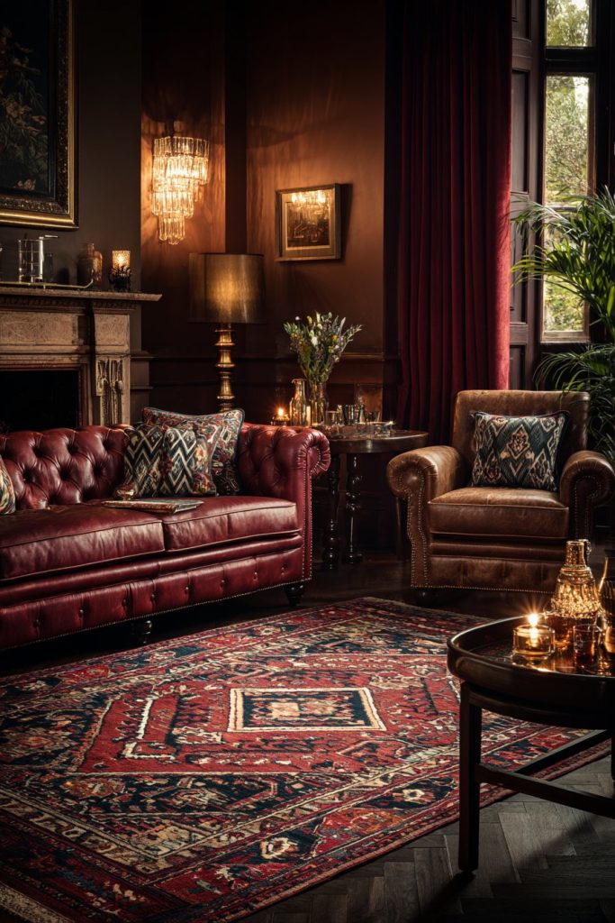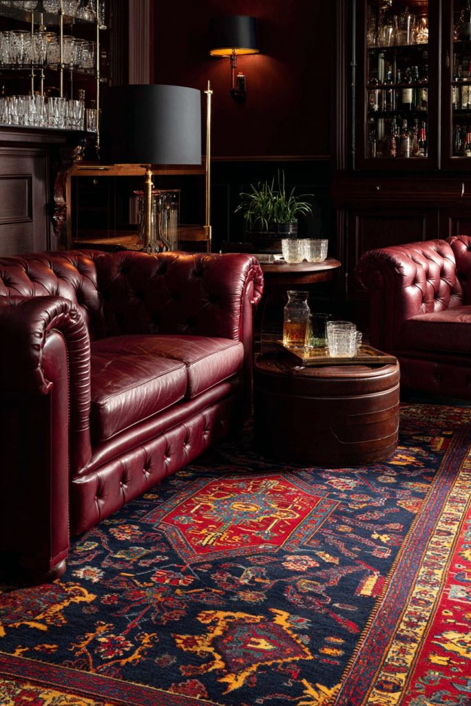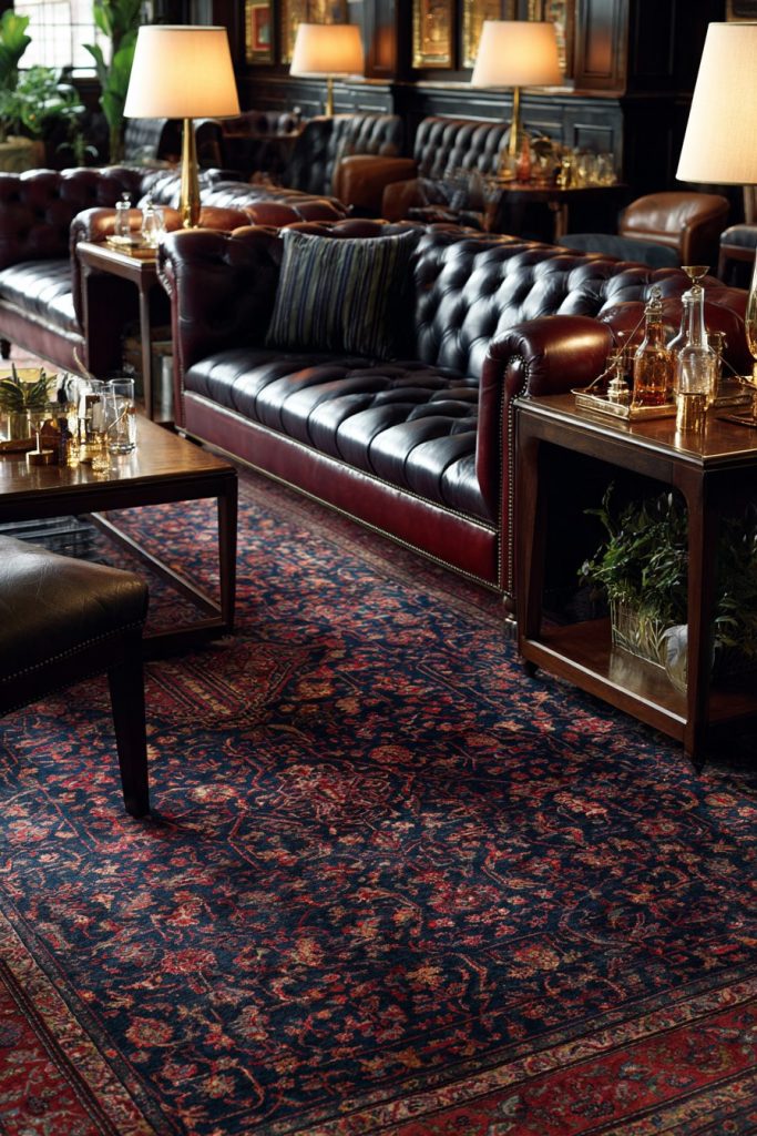 The Persian rug in deep navy and burgundy features intricate traditional motifs that tell stories through their symbolic patterns and expert craftsmanship. These rich, jewel-toned colors create a dramatic foundation that anchors an elegant seating area featuring a tufted leather Chesterfield sofa and matching armchairs. The deep, saturated colors of the rug complement the leather upholstery beautifully, creating a cohesive and sophisticated color scheme.