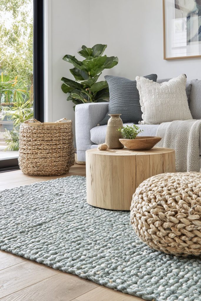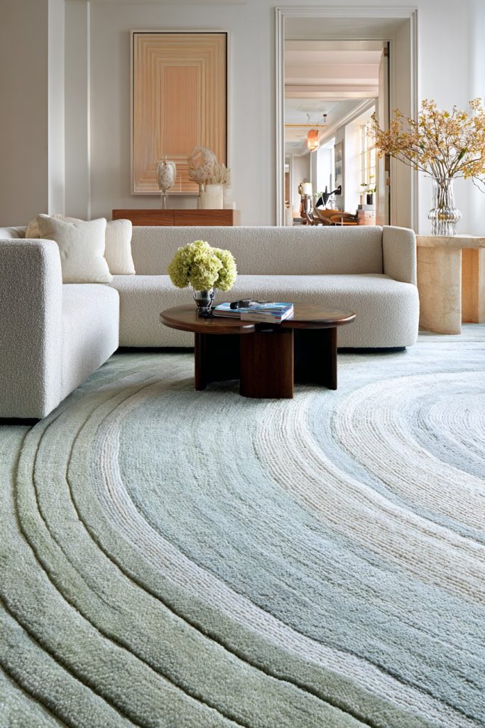 - Choose furniture with clean lines and natural materials to complement the rug’s organic appeal