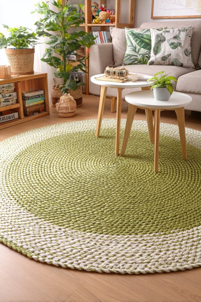 The round woven rug in soft sage green and natural cream stripes serves multiple functions in this compact apartment setting. Its circular shape helps maximize the available floor space while creating visual interest that breaks up the angular lines typically found in small rooms. The soft sage green adds a calming, nature-inspired element that makes the space feel larger and more serene, while the cream stripes provide subtle pattern without overwhelming the limited square footage.