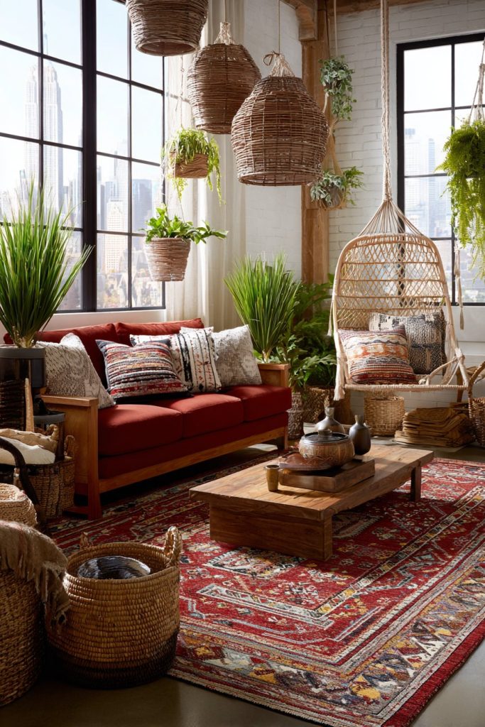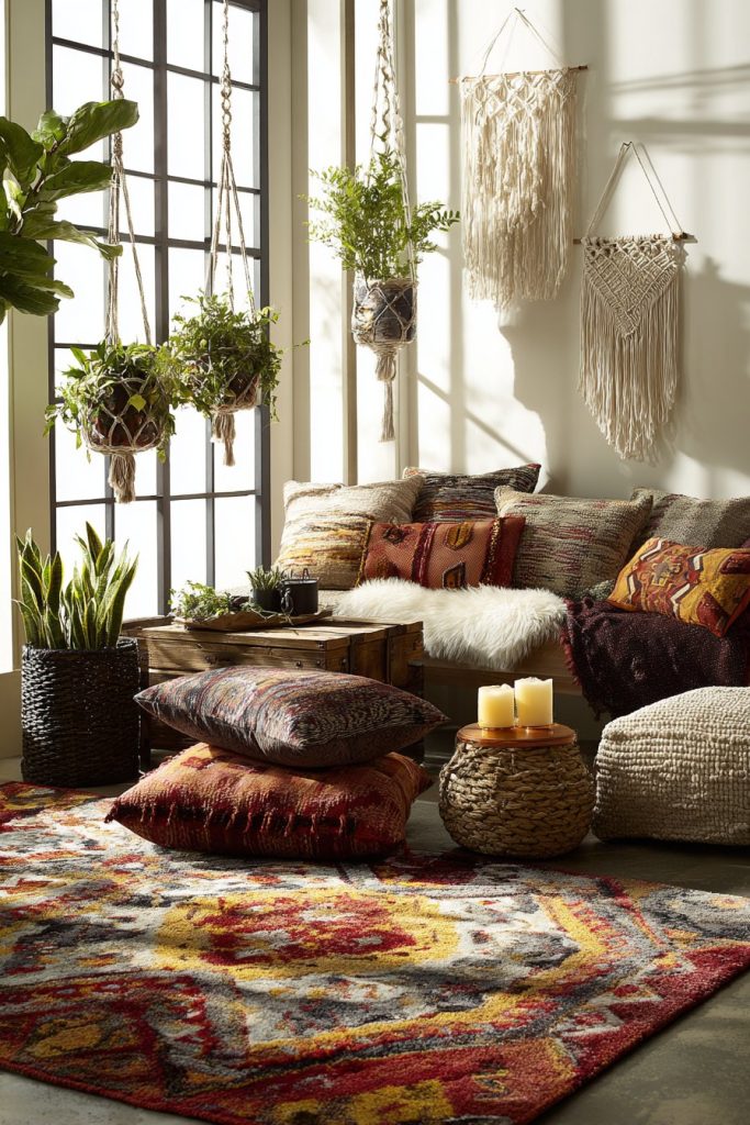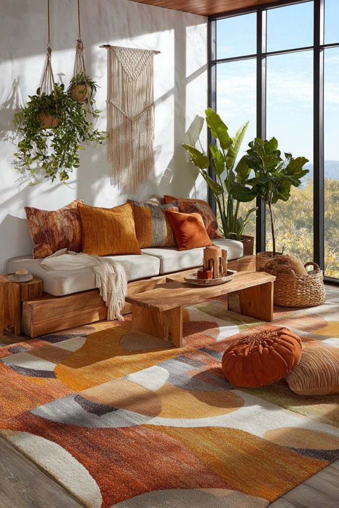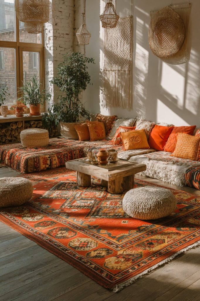 This rug serves as the foundation for an intentionally mixed seating arrangement including floor cushions, a low wooden coffee table, and abundant hanging plants that create vertical interest and natural beauty. Macrame wall hangings and woven baskets add layers of texture and handcrafted appeal, demonstrating the bohemian appreciation for artisanal crafts and global influences. Natural lighting from multiple windows creates dynamic shadows throughout the day, emphasizing the rug’s bold geometric patterns and rich color variations while highlighting the space’s eclectic collection of textures and materials.
