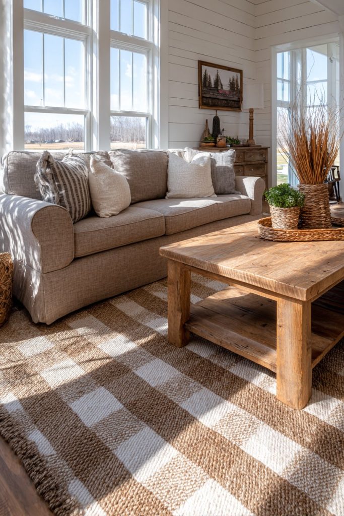 Combine rustic charm with contemporary sophistication through a vintage-style rug that demonstrates how modern farmhouse design successfully balances comfort with elegance. This increasingly popular design approach shows how traditional farmhouse elements can be refined and updated for contemporary living while maintaining their essential warmth and character.