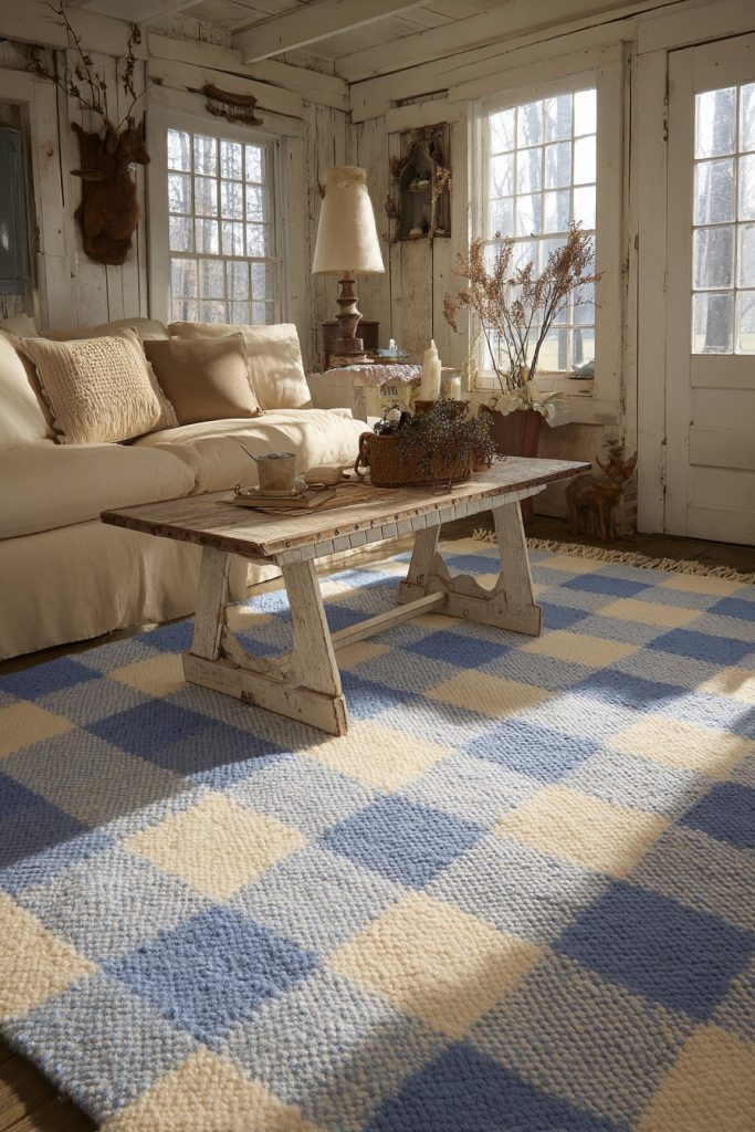 The braided wool rug in cream and soft blue checks showcases traditional American rug-making techniques while providing durable, comfortable flooring for everyday family life. Positioned beneath a weathered wood coffee table and comfortable slipcovered sofa, the rug anchors a seating arrangement that prioritizes comfort and functionality without sacrificing style. The soft blue and cream color combination creates a serene, classic palette that feels both timeless and fresh.