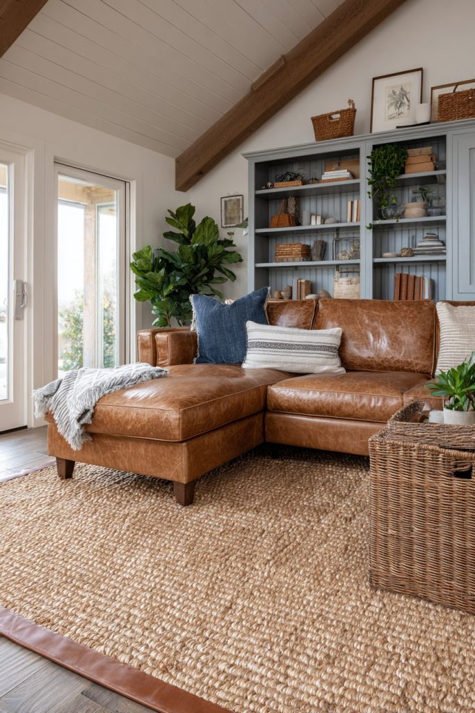 Address the practical needs of busy family life with a durable sisal rug featuring leather border details that proves style and functionality can coexist beautifully in high-traffic living areas. This design approach demonstrates how careful material selection and thoughtful design can create spaces that maintain their beauty despite daily wear and active family use.