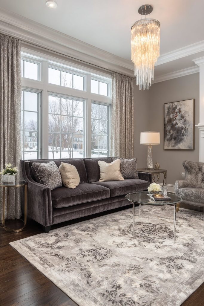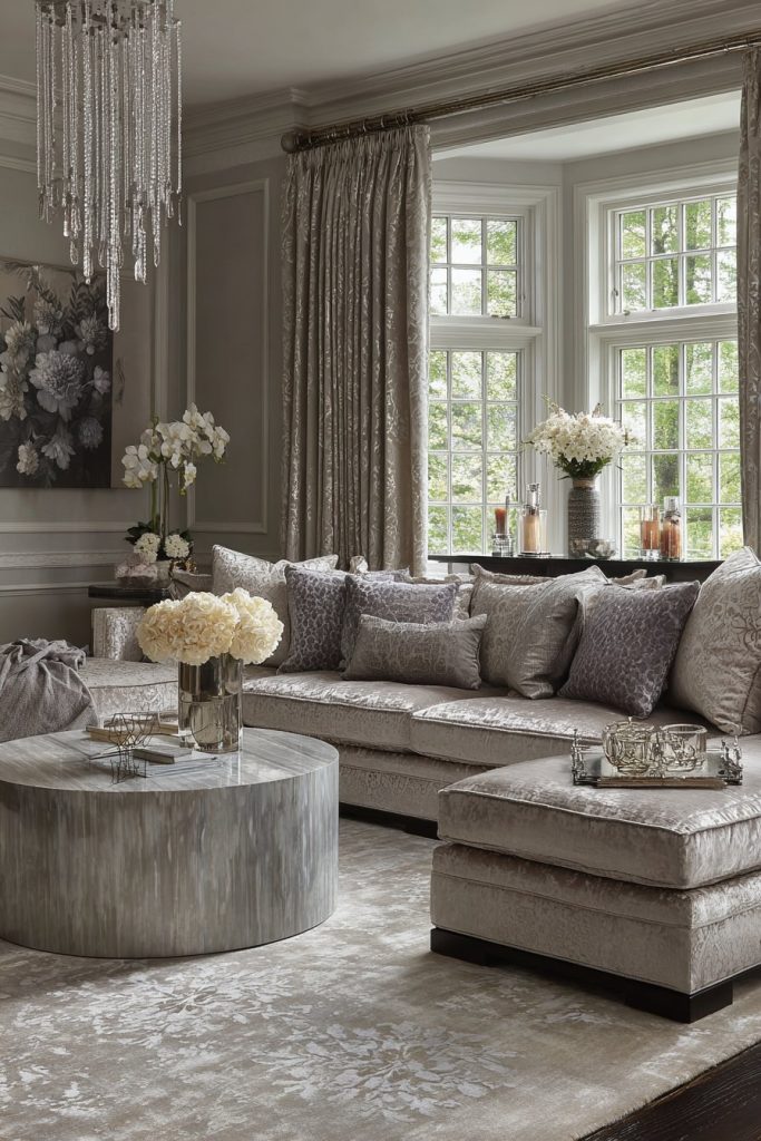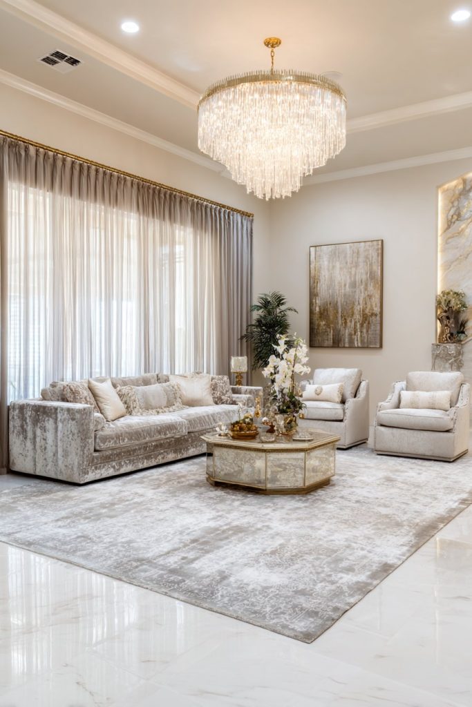 The hand-knotted rug in soft silver and cream features subtle damask patterns that showcase exceptional craftsmanship and attention to detail. Its oversized proportions create dramatic impact while providing elegant foundation for a formal seating area featuring velvet-upholstered furniture and crystal chandelier overhead. The subtle silver and cream color palette creates sophisticated neutrality that allows other luxury materials to shine while maintaining overall design cohesion.