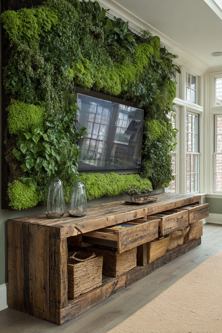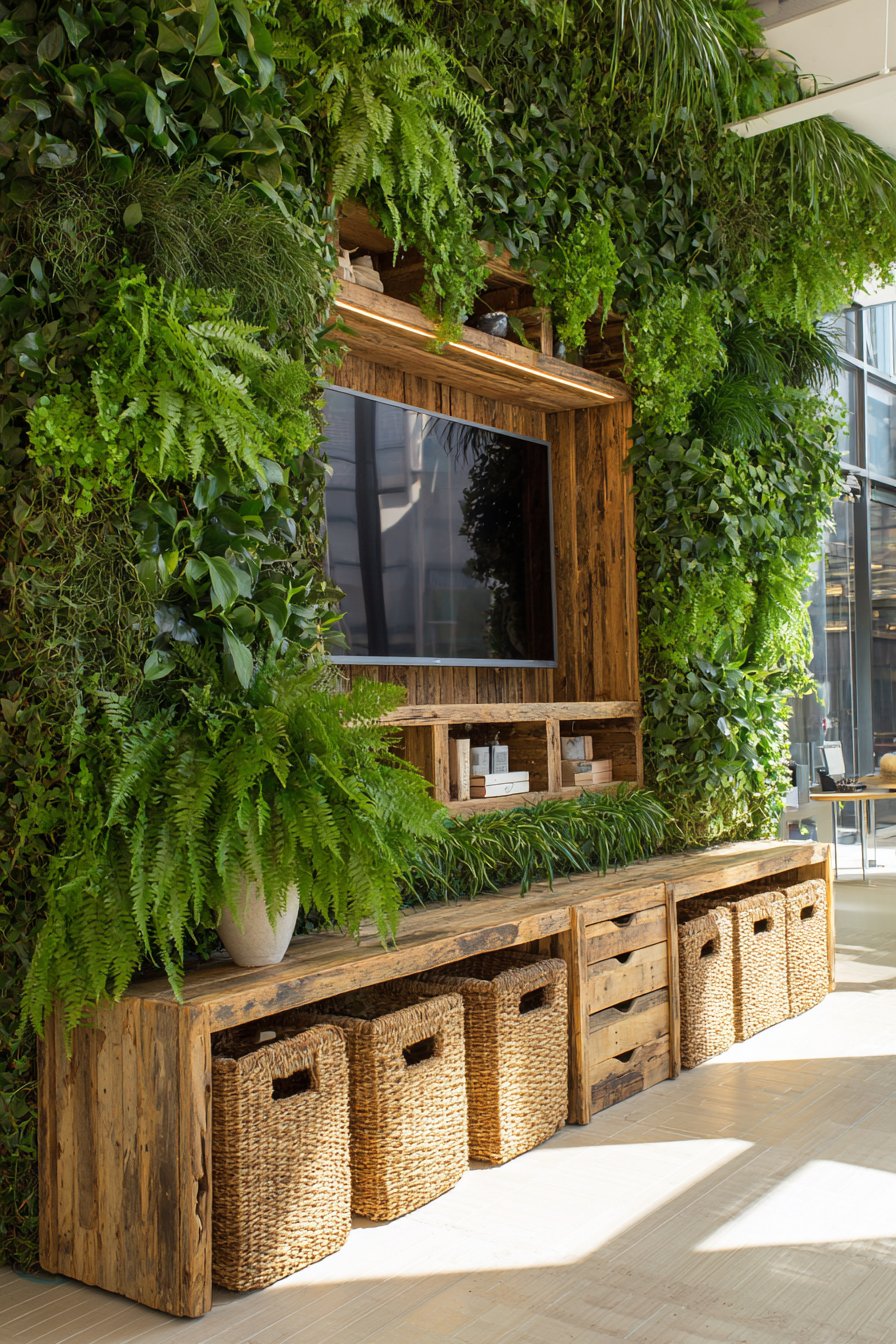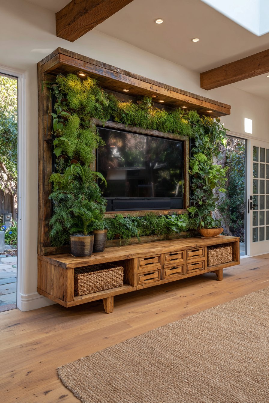 Combine entertainment with environmental consciousness in this sustainable media wall incorporating reclaimed materials and eco-friendly elements. The television mounts on a living plant wall system with integrated drip irrigation, surrounded by air-purifying plants including pothos, philodendron, and ferns that improve indoor air quality while creating a stunning green backdrop. The plants soften the technology while bringing nature indoors.