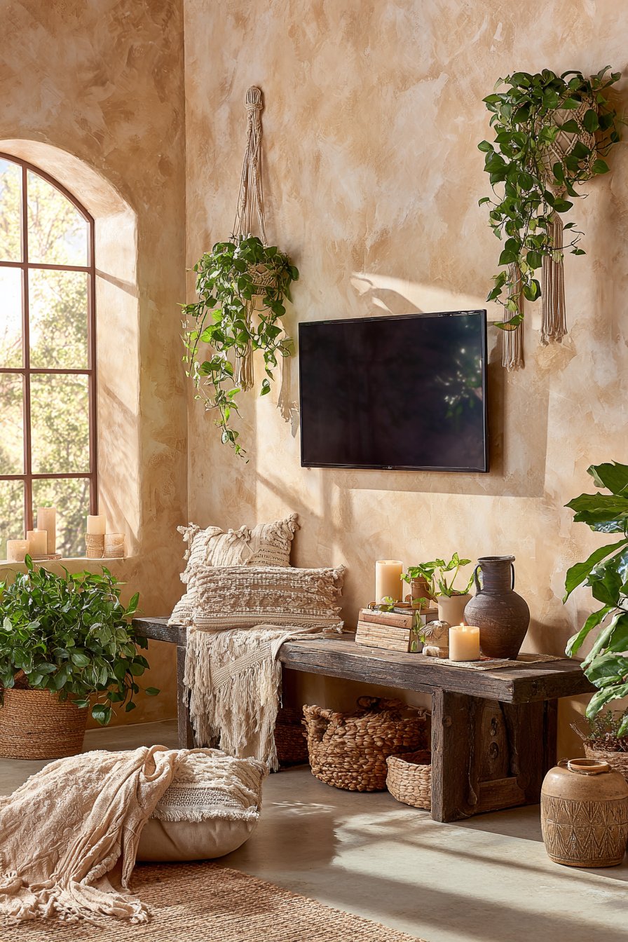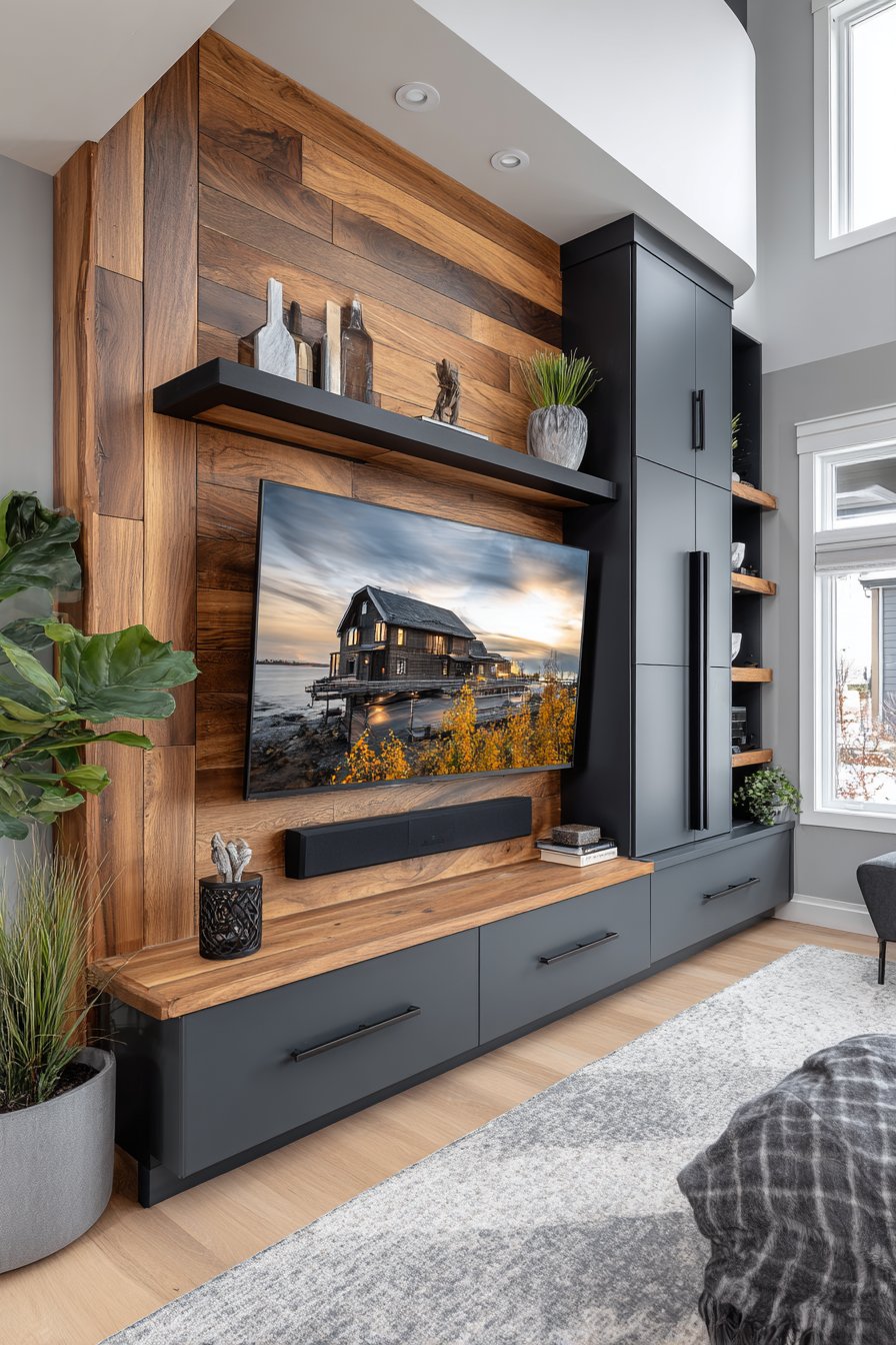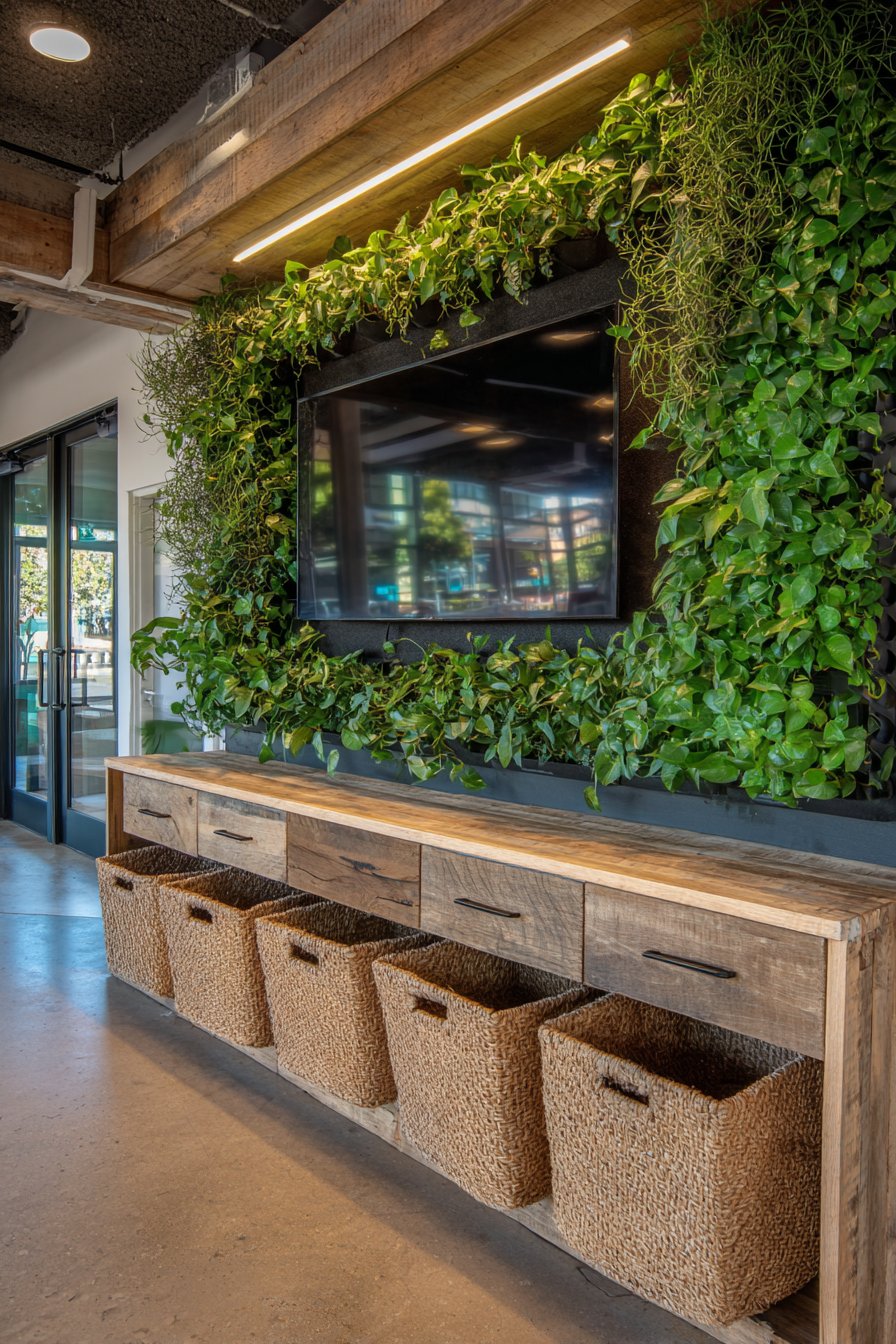 Combine entertainment with environmental consciousness in this sustainable media wall incorporating reclaimed materials and eco-friendly elements. The television mounts on a living plant wall system with integrated drip irrigation, surrounded by air-purifying plants including pothos, philodendron, and ferns that improve indoor air quality while creating a stunning green backdrop. The plants soften the technology while bringing nature indoors.