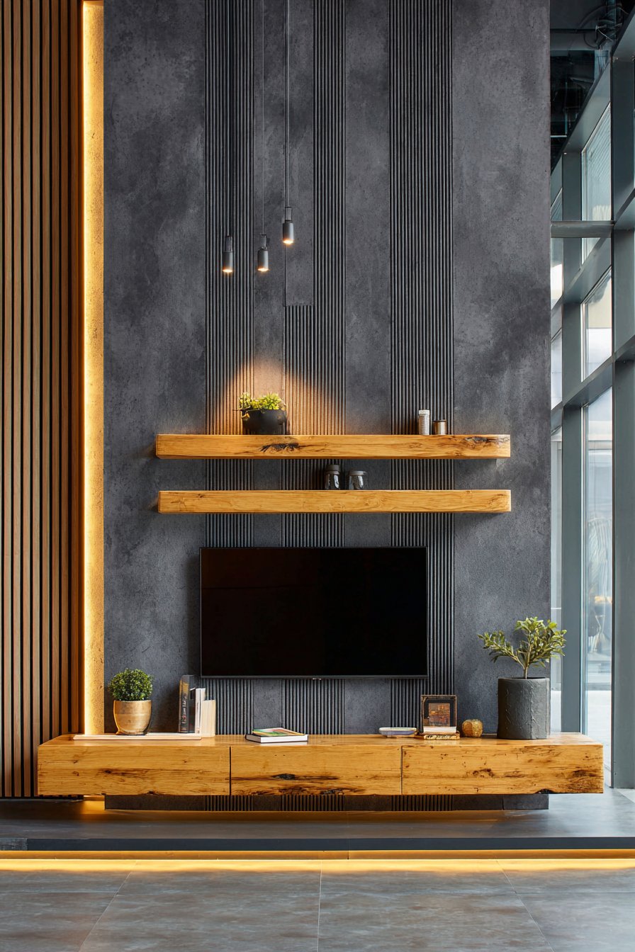 Step into a space where modern minimalism meets acoustic sophistication. This media wall concept centers on a sleek floating TV console crafted from natural oak, its clean horizontal lines creating an uncluttered foundation for your entertainment system. The true genius of this design lies in the floor-to-ceiling grey textured acoustic panel that spans the entire wall behind the television, serving dual purposes as both a striking visual element and a functional sound-dampening feature that enhances your viewing experience.