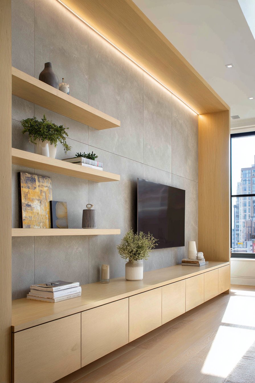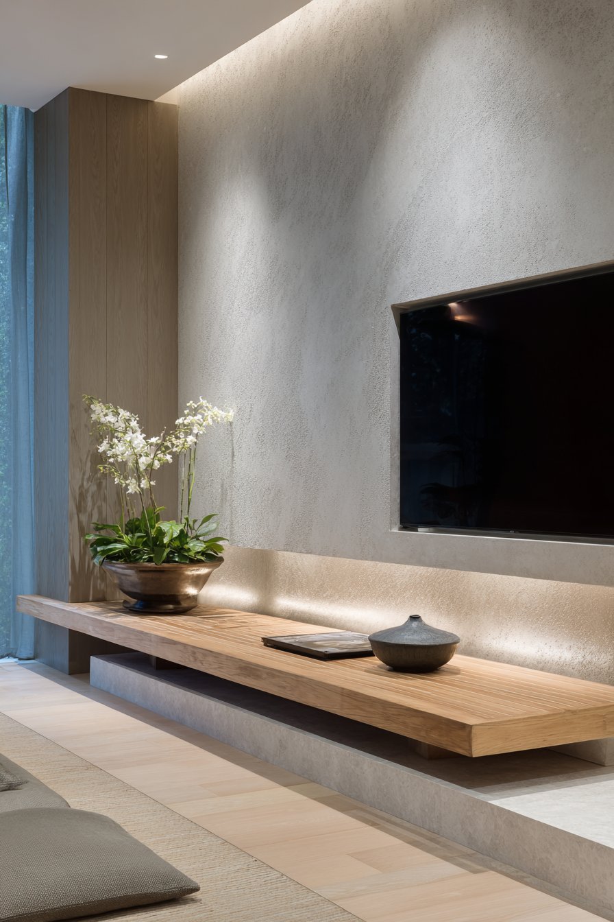 The slim floating shelves positioned on either side of the console maintain the minimalist aesthetic while providing just enough display space for carefully curated items—perhaps a small succulent in a concrete planter, a single design book with a beautiful spine, or a sculptural object that adds personality without creating visual chaos. The integrated cable management system keeps unsightly wires hidden, maintaining the clean lines that define this approach. Recessed LED strip lighting creates a subtle glow behind the console, adding depth and drama while serving as practical ambient lighting for evening viewing.