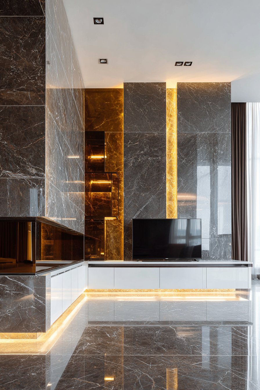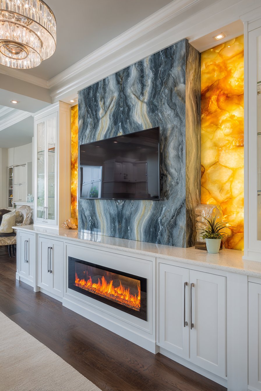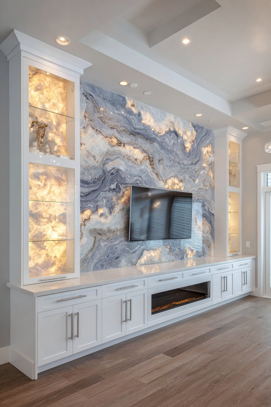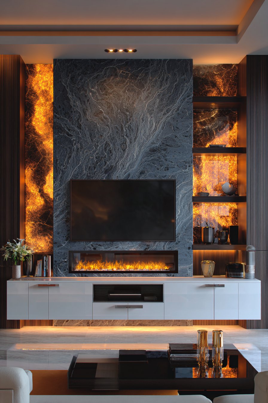 Elevate your space to five-star luxury with this dramatic media wall featuring a full-height marble accent wall in deep grey with striking white veining. The natural stone creates immediate visual impact and architectural presence that commands attention. The large mounted television becomes jewelry set against this luxurious backdrop, its technology enhanced rather than diminished by the opulent materials surrounding it. Custom-designed built-in units incorporate backlit onyx panels flanking the TV, their translucent quality and amber glow creating an ethereal, almost mystical effect.