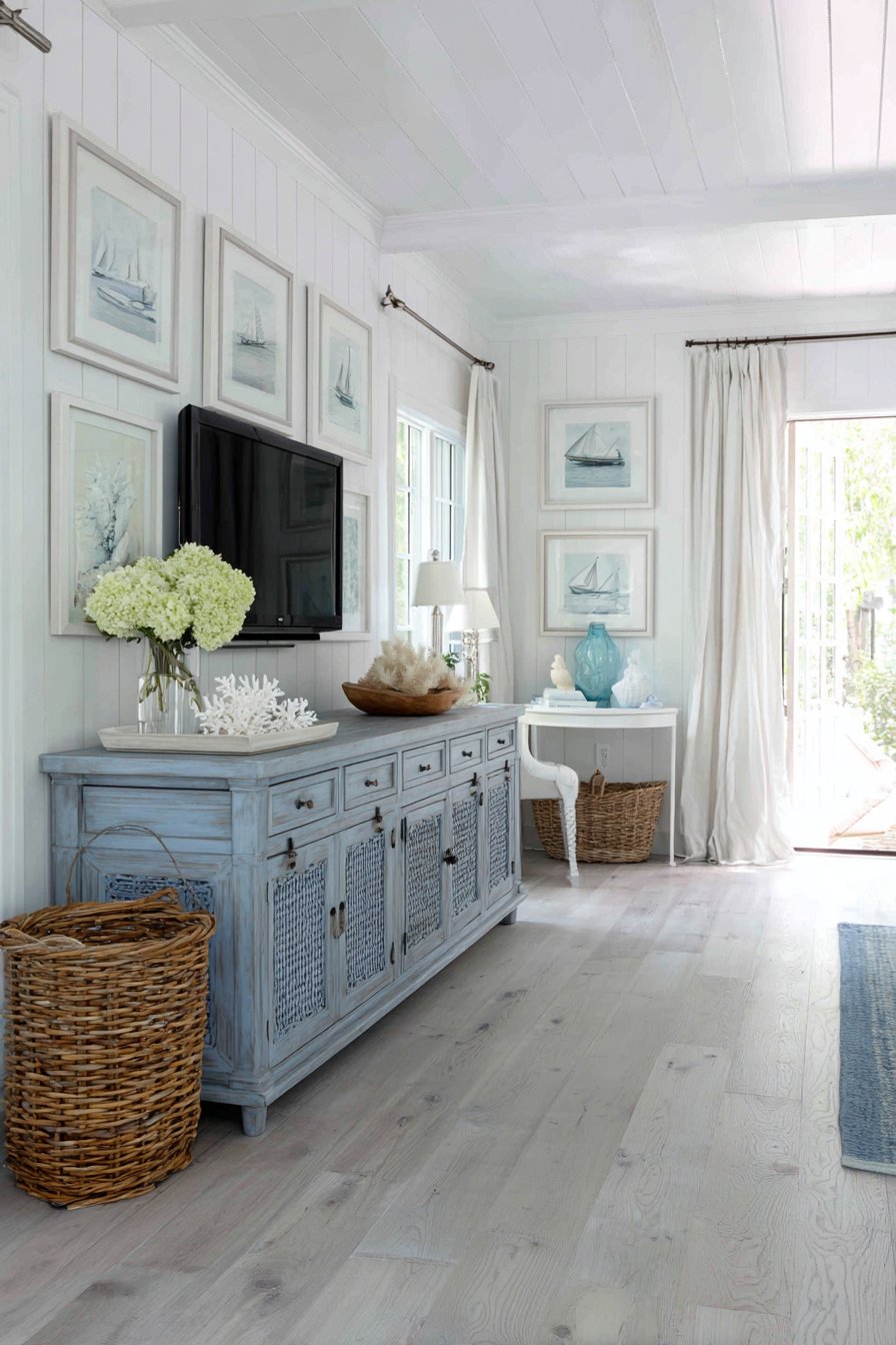 The gallery arrangement flanking the television demonstrates the Scandinavian appreciation for art and personal expression within minimalist frameworks. Black and white photography adds visual interest without introducing color complexity, while the slim frames maintain the clean aesthetic. This is design that breathes, where negative space is valued as much as the objects themselves. The wide-angle interior photography showcases how every element contributes to the overall sense of spaciousness and tranquility, proving that minimalism doesn’t mean cold or unwelcoming.