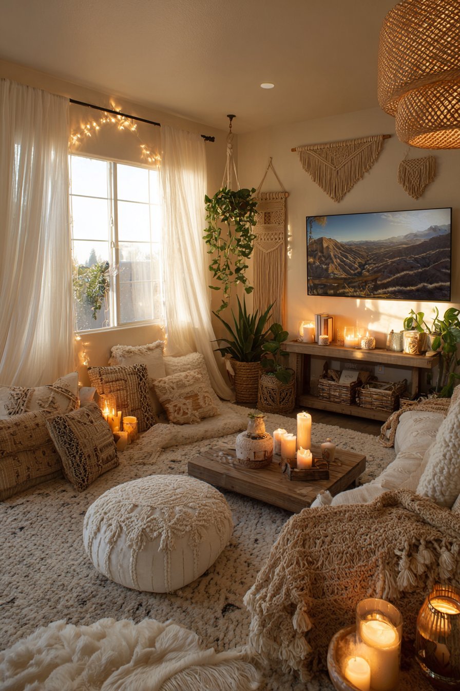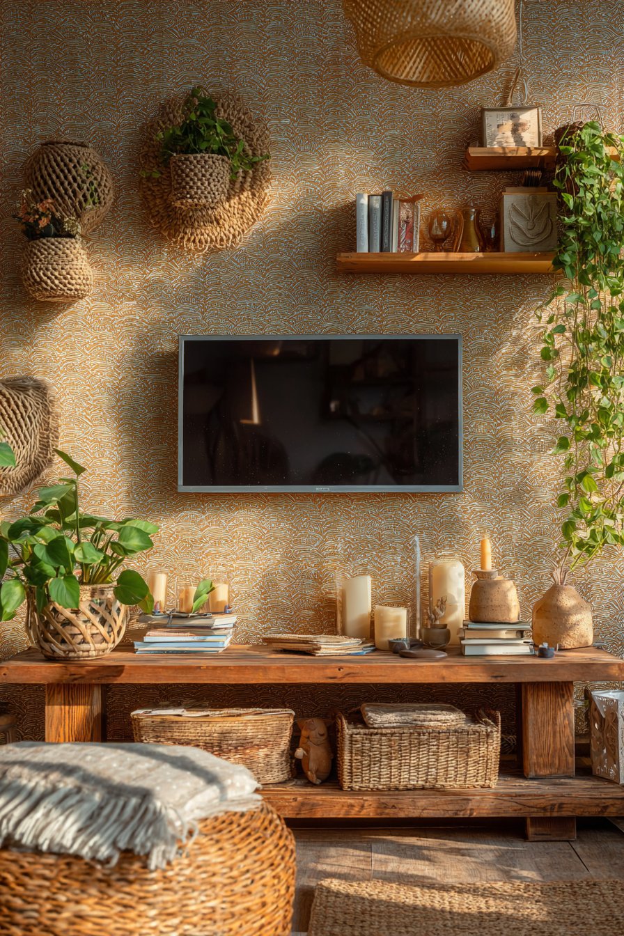 The media console features FSC-certified wood with natural oil finish rather than chemical-laden lacquers, while bamboo drawer organizers provide interior storage solutions using rapidly renewable materials. Energy-efficient LED bias lighting behind the screen reduces eye strain during viewing while consuming minimal electricity. Natural jute baskets provide storage that’s both beautiful and biodegradable.
