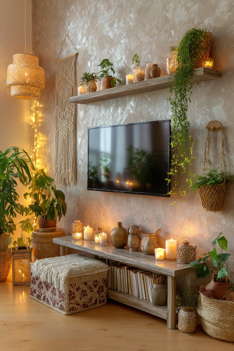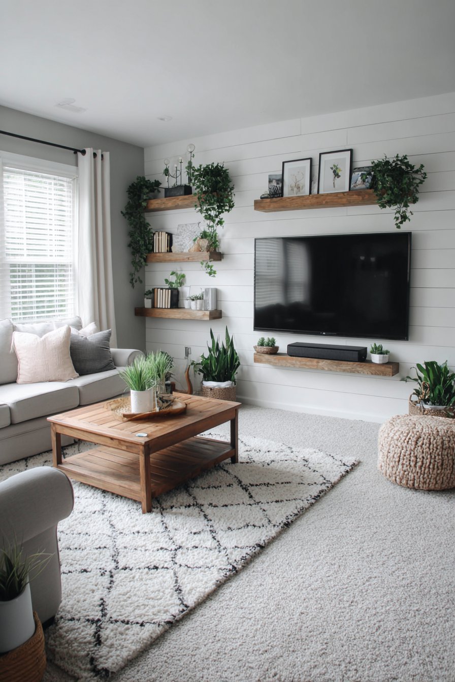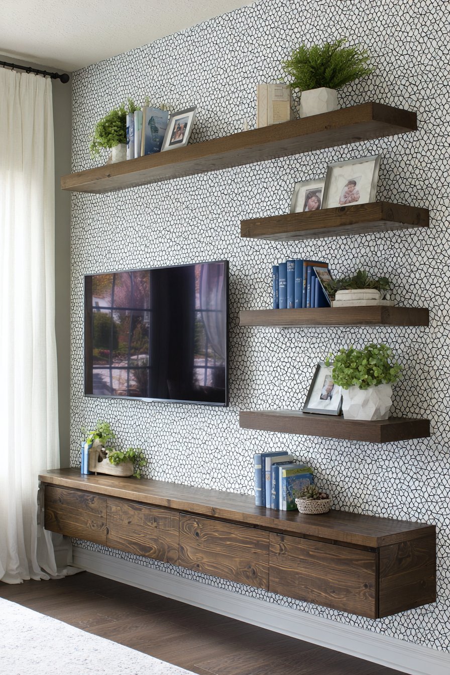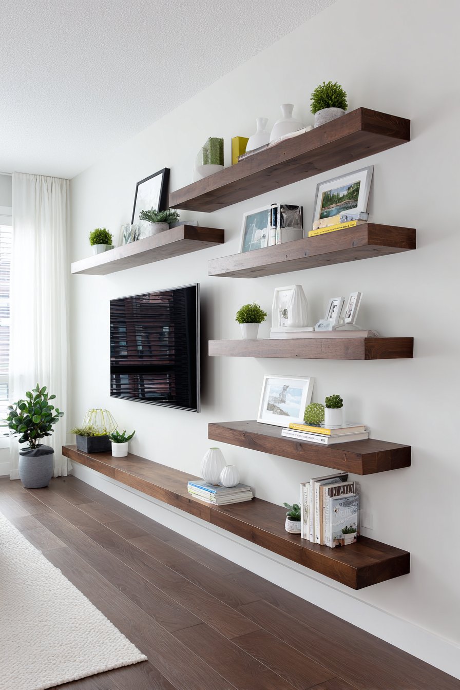 Budget consciousness doesn’t require sacrificing style. The DIY floating shelf design proves that beautiful spaces can emerge from affordable materials and personal labor. Thrifted accessories, propagated plants, and framed personal photos cost little but create authentic personality. Peel-and-stick products enable temporary transformations perfect for rental properties. Strategic investment in structural elements like television mounts and sturdy shelving, while economizing on decorative accessories, creates a balanced approach accessible to varied budgets.