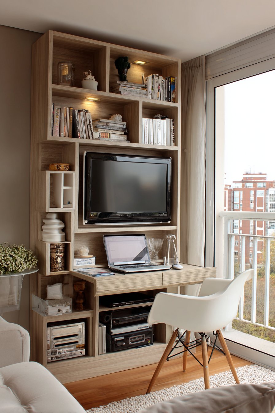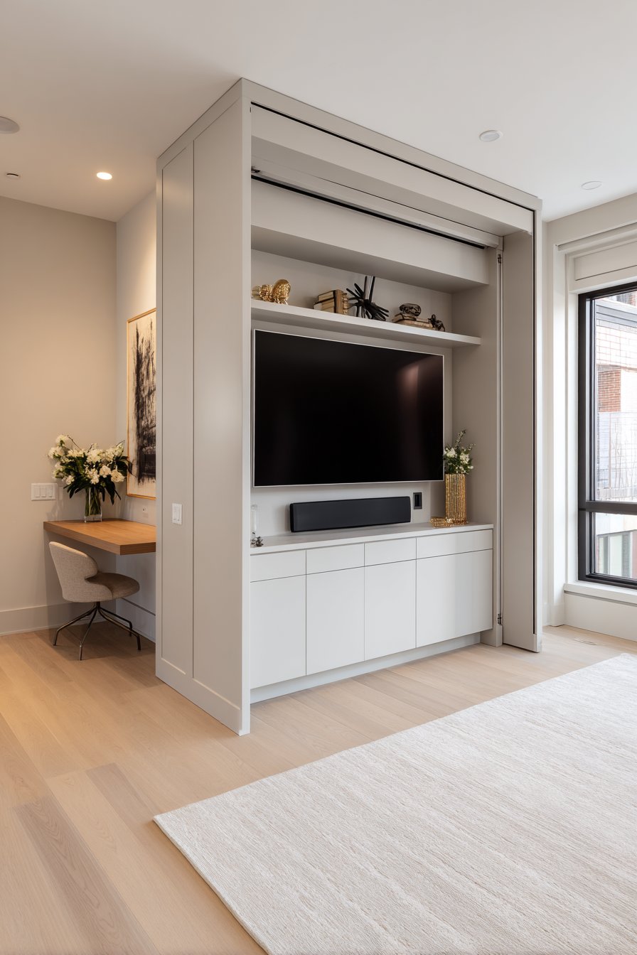 Maximize limited square footage with this ingenious small apartment media wall featuring a multi-functional wall unit where entertainment center integrates with fold-down desk workspace and hidden storage compartments. The compact design uses vertical space efficiently with the mounted television, floating laptop shelf that folds away when not needed, and slim storage cubbies all contained within a narrow footprint that doesn’t overwhelm the small room.