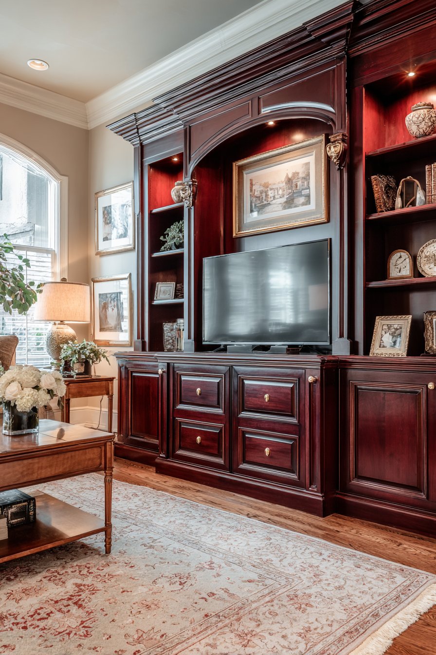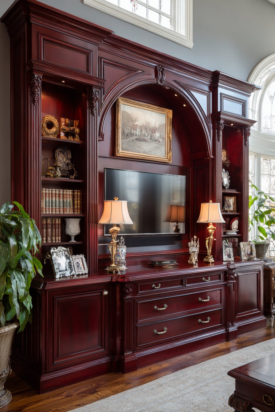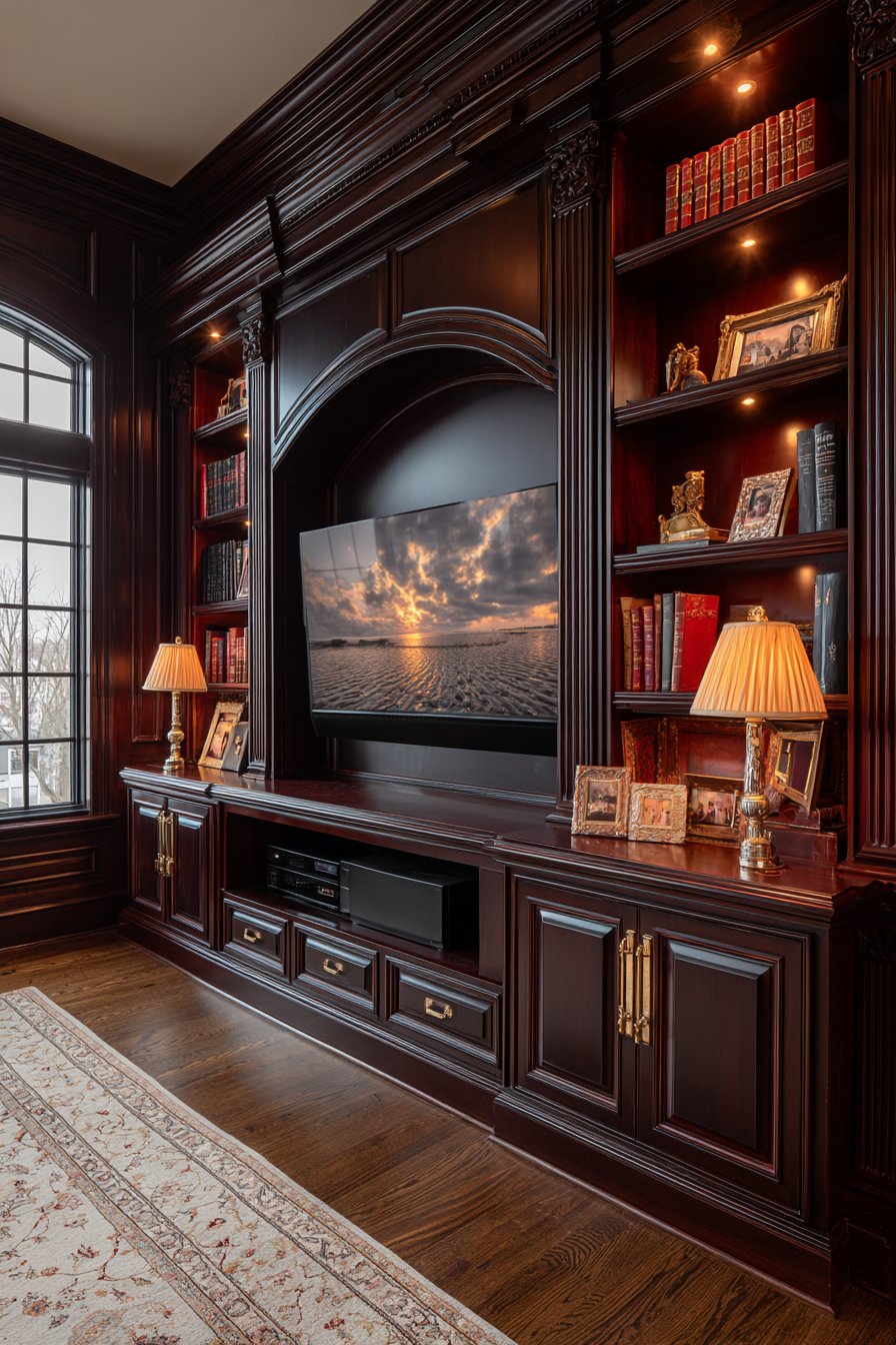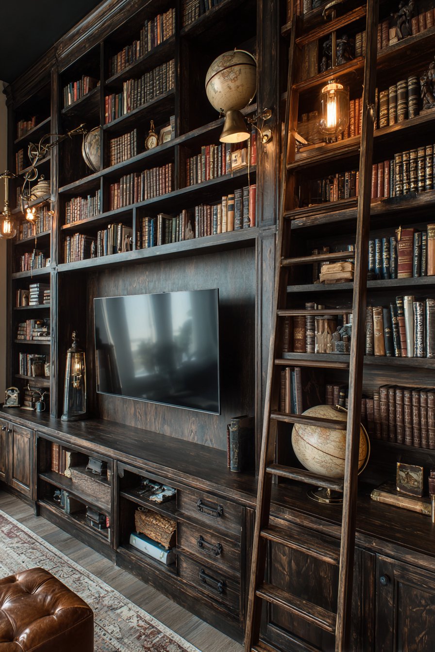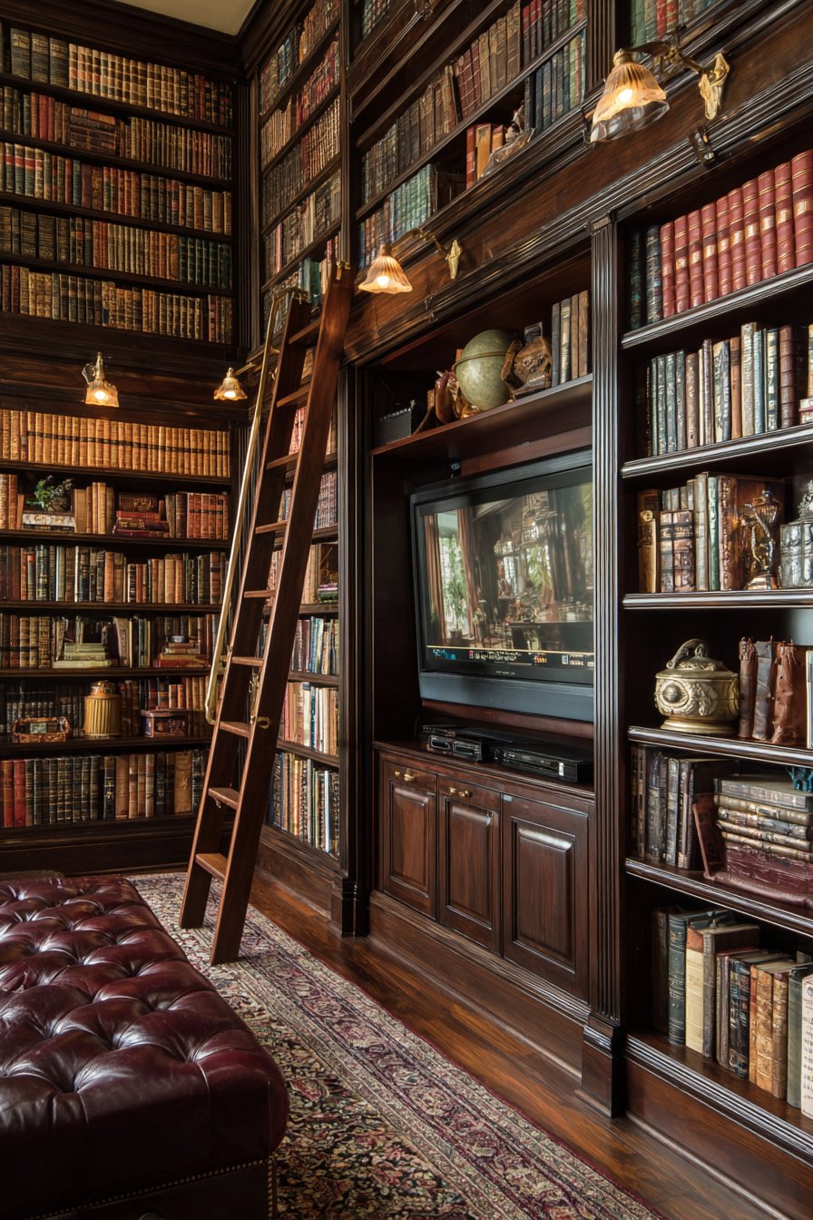 Create sophisticated media wall where floor-to-ceiling dark wood bookshelves surround the television, which discretely integrates behind retractable wood panel doors that match the surrounding bookcases. Rolling library ladder provides access to upper shelves filled with hardcover books organized by subject or aesthetically by spine color. When the television isn’t in use, the space reads as a traditional library or study rather than entertainment center.