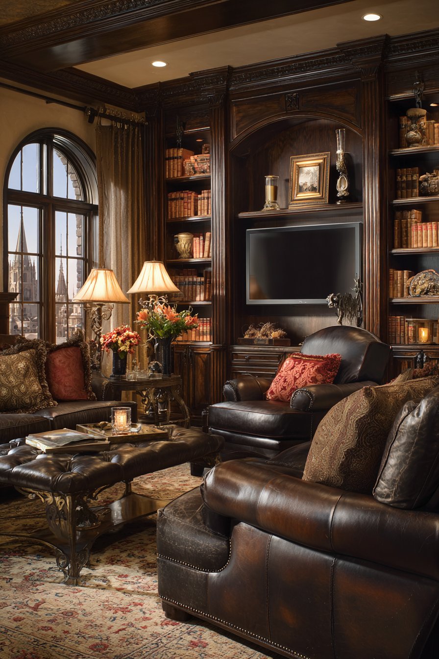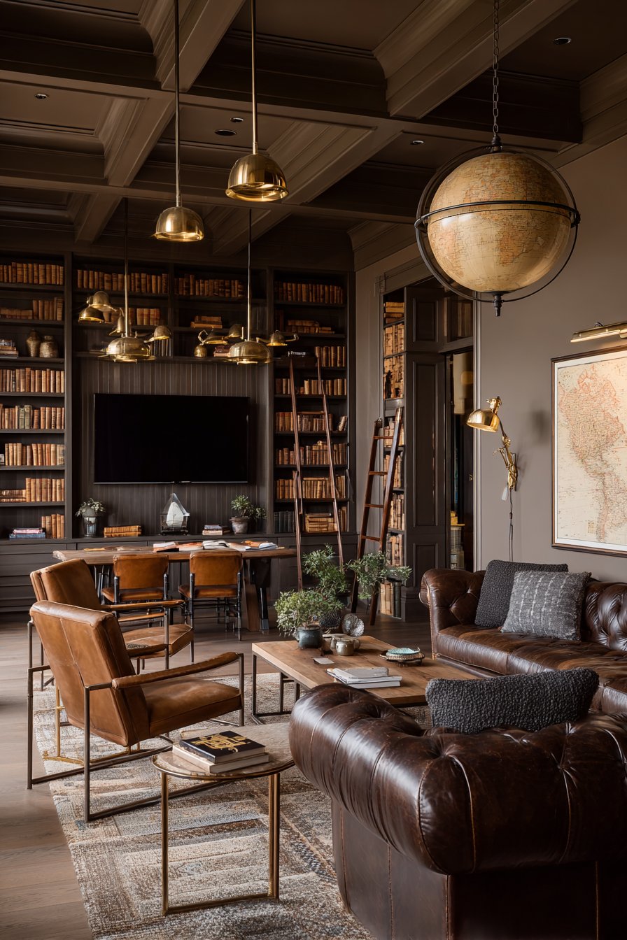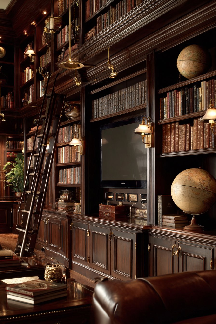 Leather-bound volumes, brass bookends, and vintage globes create scholarly atmosphere that celebrates literature and learning. Warm overhead lighting from traditional brass fixtures supplements adjustable reading lamps positioned on shelves for functional task lighting. The book collection becomes architectural feature and the television becomes optional technology rather than room-defining element.