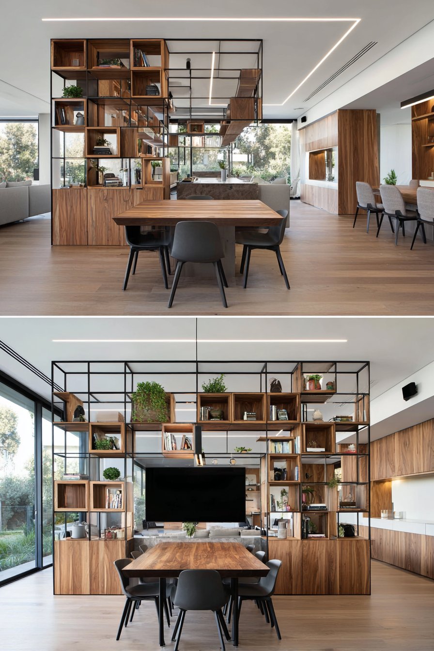 The genius of this design lies in the warm wood backing within each cube, which prevents the black metal from feeling too cold or industrial. This contrast between dark metal and natural wood creates warmth and depth, making the installation feel approachable despite its bold geometry. Some cubes house media equipment, others display carefully selected books arranged both vertically and horizontally, while a few showcase decorative objects and small plants that introduce organic elements into the structured composition.