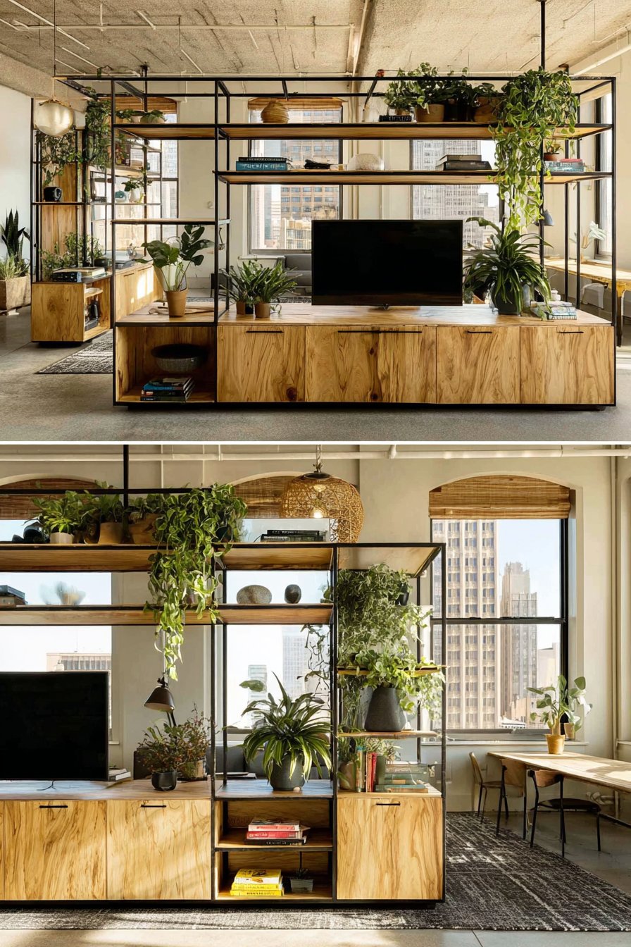 Material selection plays a crucial role in media wall success. Natural wood brings warmth and organic texture that prevents technology-focused spaces from feeling cold or sterile. The reclaimed barn wood design and Japanese bamboo console demonstrate how authentic materials add character and depth. Metal elements—whether industrial pipe shelving, brass art deco accents, or sleek matte black frameworks—introduce different visual weights and surface qualities. Stone and marble provide luxury and permanence, while painted surfaces offer color flexibility and clean backgrounds. The most successful designs often combine multiple materials thoughtfully, like the natural oak and matte black geometric cube system or the walnut and metal room divider.