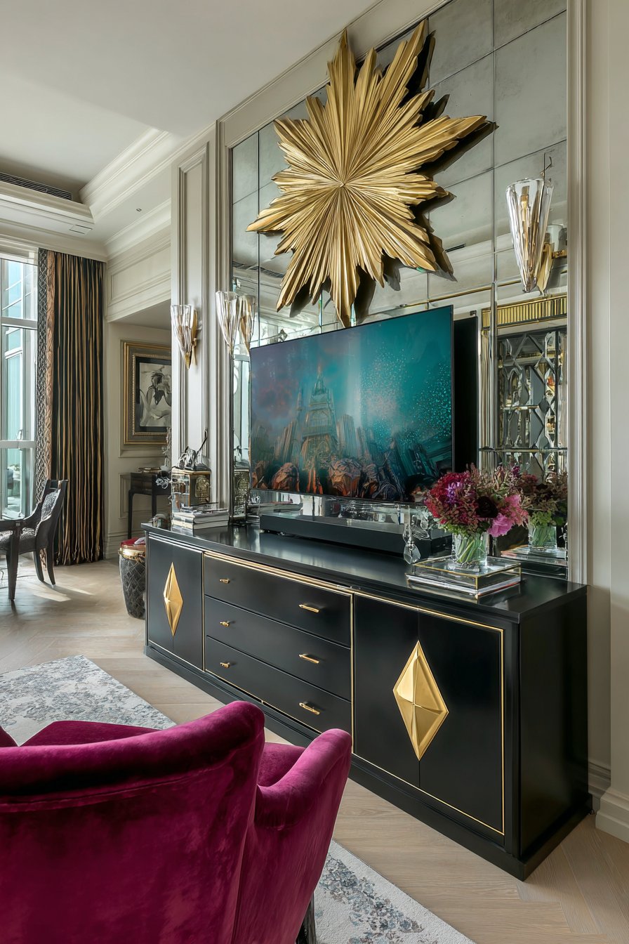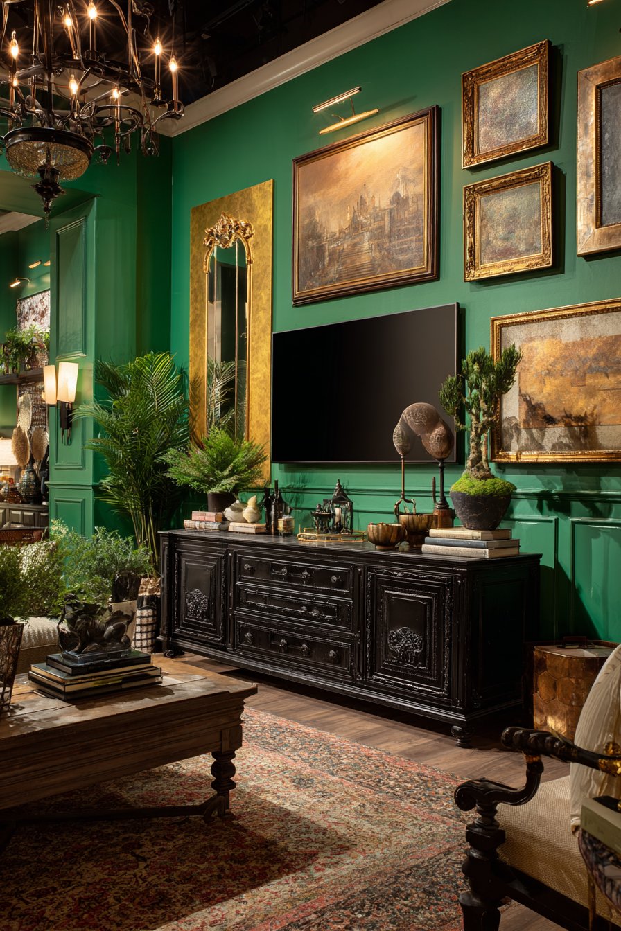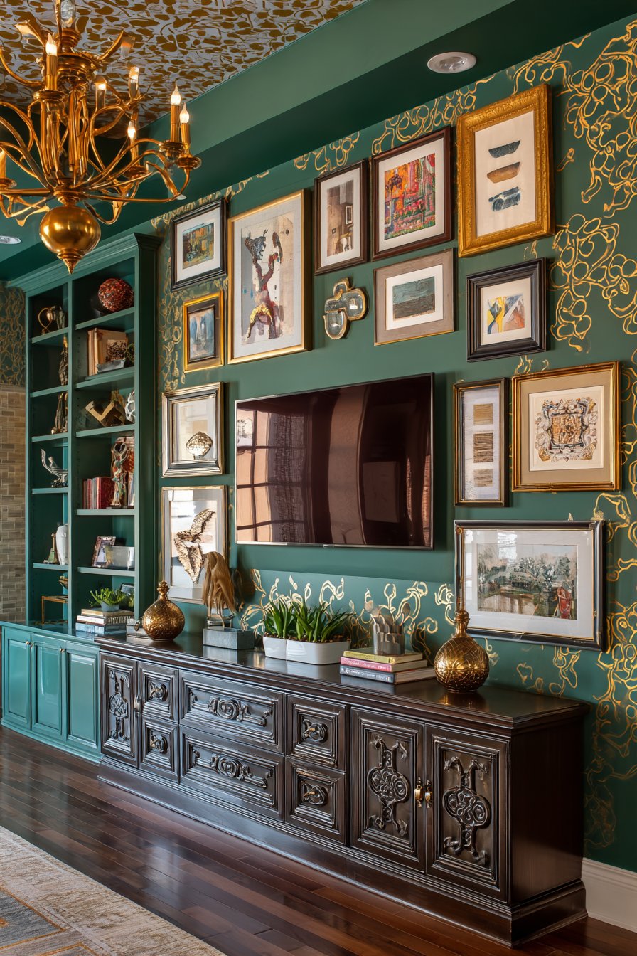 Embrace abundance with this maximalist media wall showcasing bold emerald green walls that create saturated color drama. Gold metallic wallpaper accent panels frame the television, their reflective surface catching and multiplying light while adding opulent decoration. Ornate gold-framed mirrors and eclectic art pieces surround the screen in an intentional salon-style arrangement that fills the wall with visual richness.
