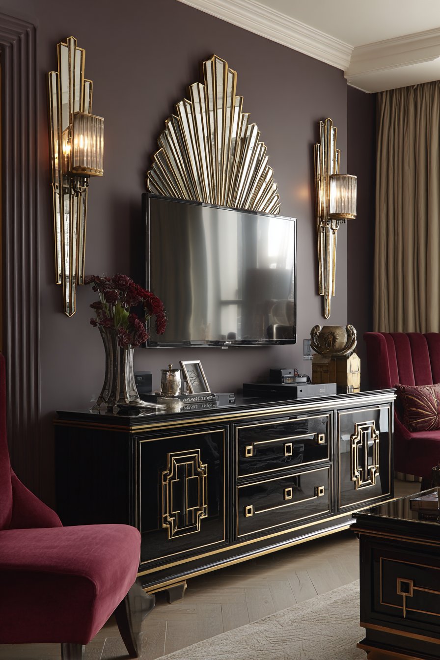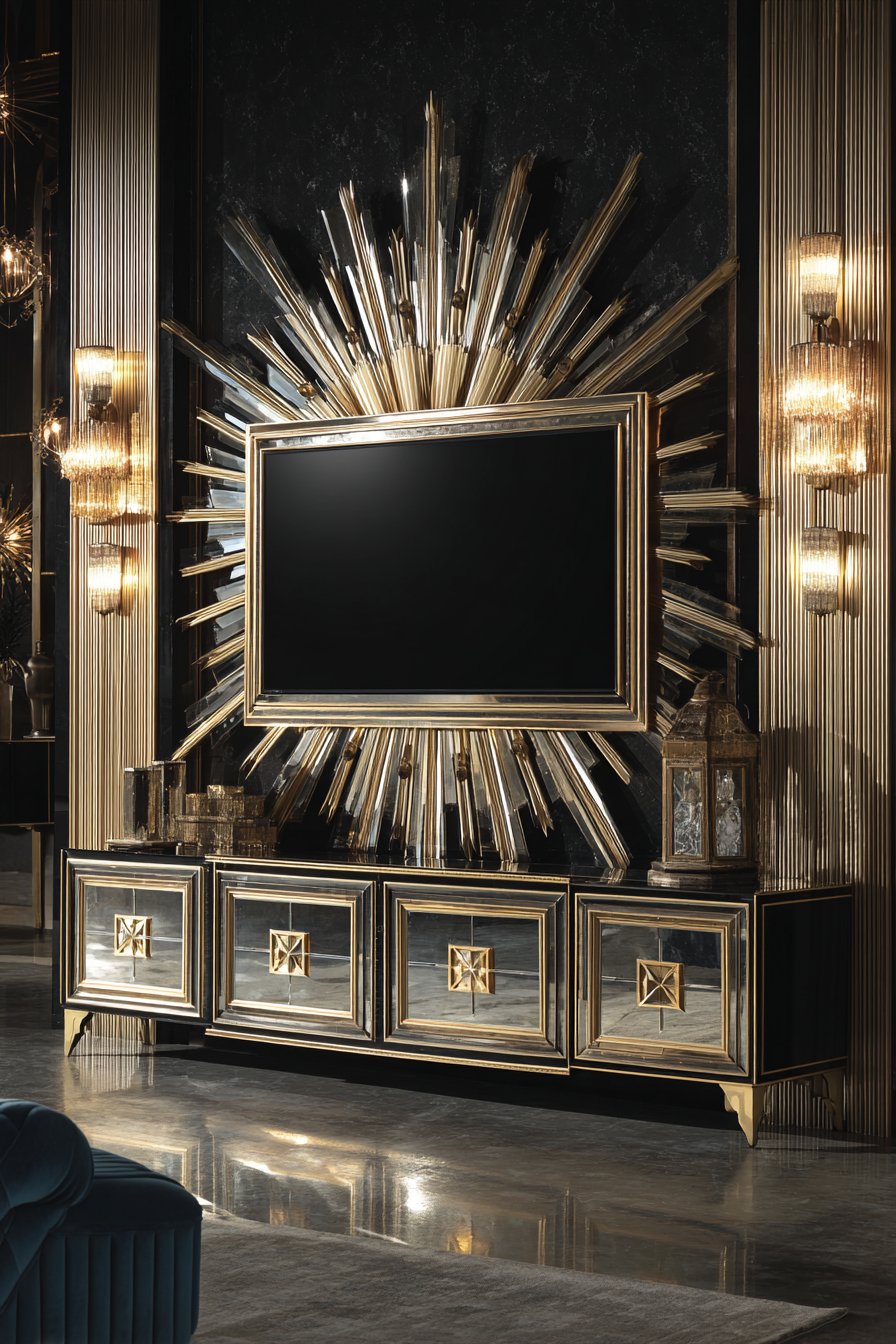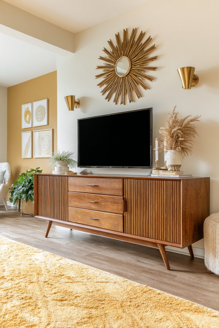 Travel back to the golden age of design with this mid-century modern media wall featuring a vintage-inspired teak credenza with characteristic tapered legs serving as the television console. The warm honey tones of teak wood glow with natural beauty, while the credenza’s clean lines and sliding doors exemplify the form-follows-function philosophy of 1950s and 60s design. Above the mounted television, a sunburst mirror catches light and creates a focal point, its radiating spokes embodying the optimistic, atomic-age aesthetic of the era.