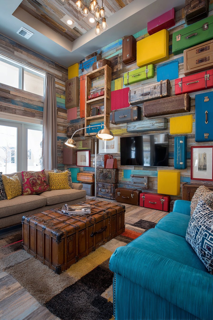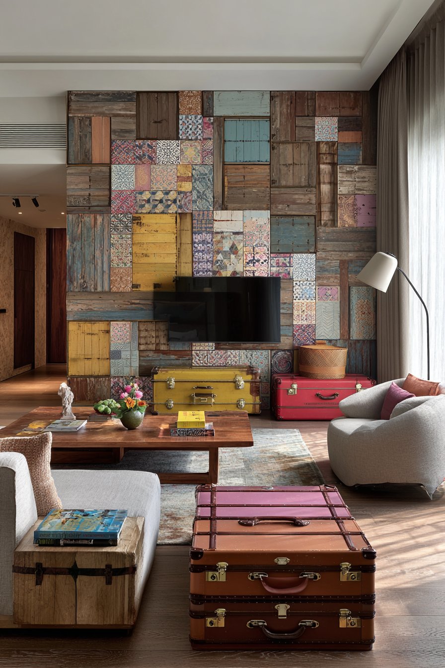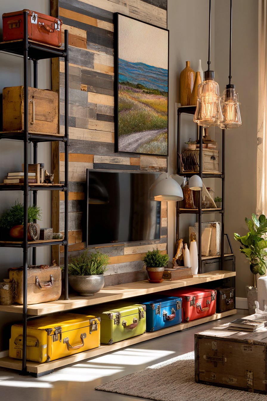 Natural lighting from nearby windows creates gentle shadows that dance across the varied surface of the wood planks throughout the day, constantly revealing new details in the grain patterns and weathering. This is a media wall that improves with age and looks even better in person than in photographs. The authentic weathered character of the materials creates a space that feels collected over time rather than purchased all at once, offering a refreshing alternative to the perfection of modern manufactured furniture.