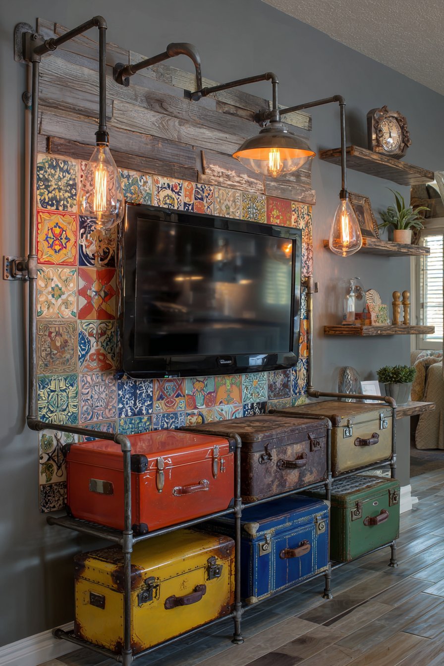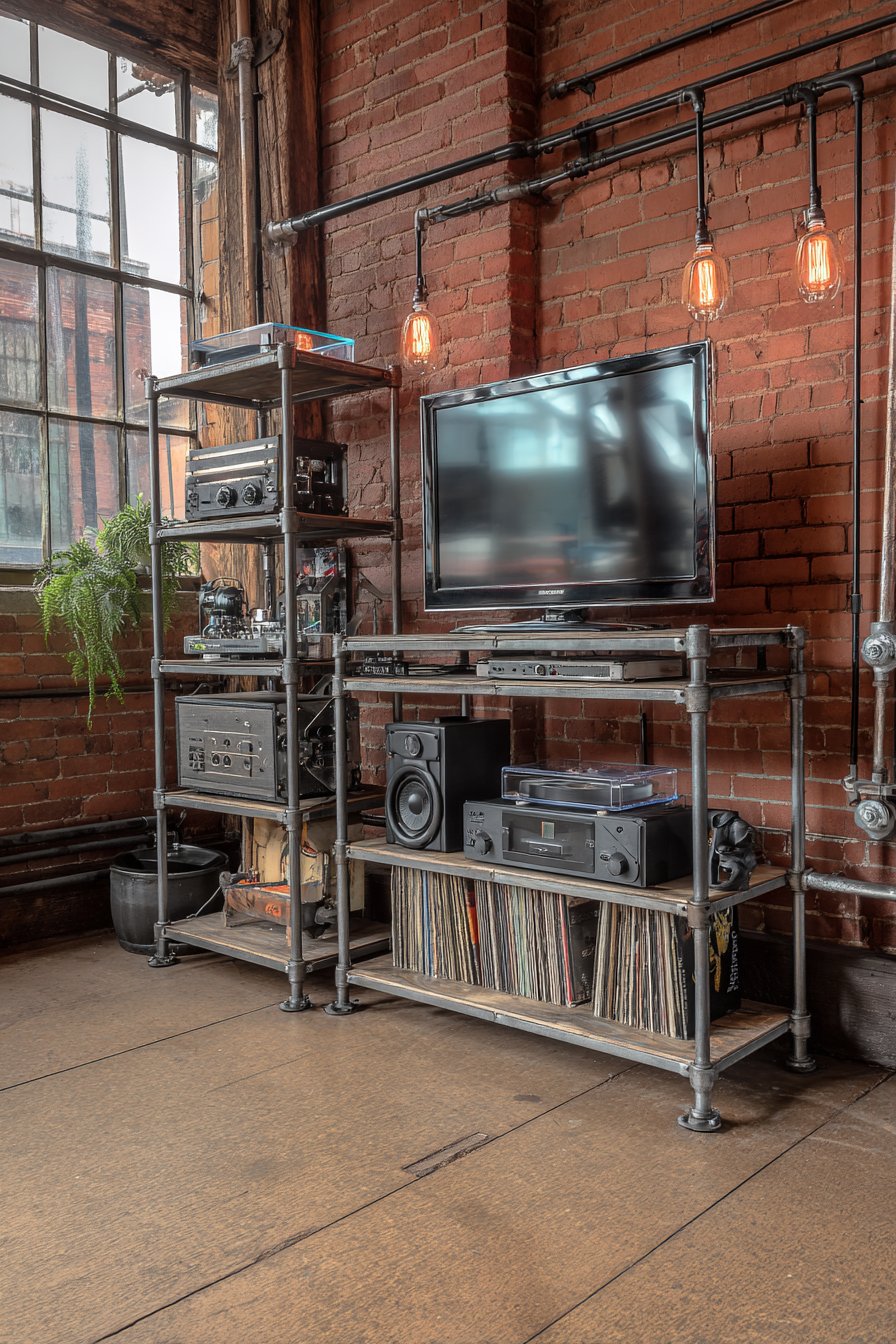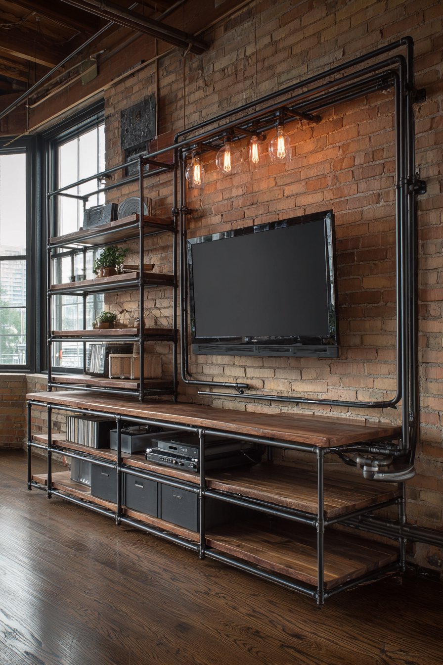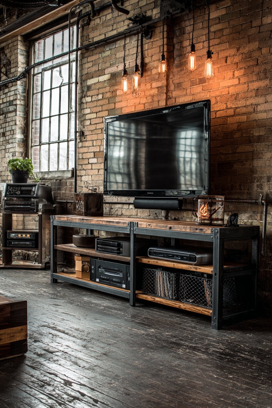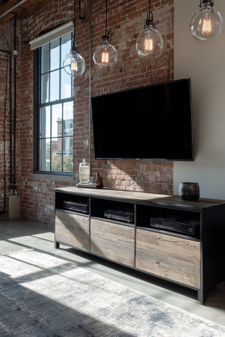 Raw authenticity defines this industrial media wall where exposed brick becomes the hero of the design story. The rough texture and varied tones of genuine brick create a backdrop rich with character and urban edge. Rather than hiding the building’s bones, this approach celebrates them, allowing the television to appear almost as if it’s floating against decades-old masonry. Visible Edison bulb pendant lights hang at varying heights, their warm filament glow and fabric-wrapped cords adding to the factory-inspired aesthetic.