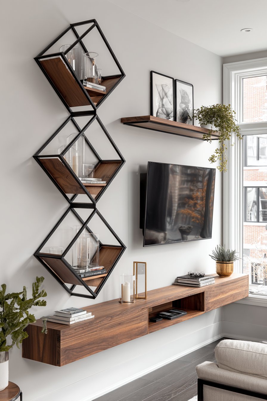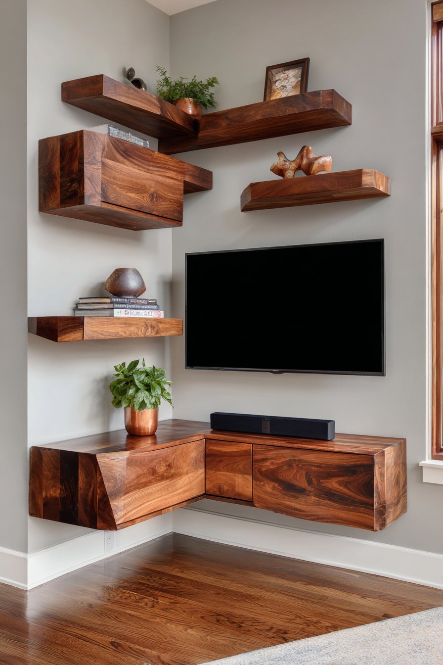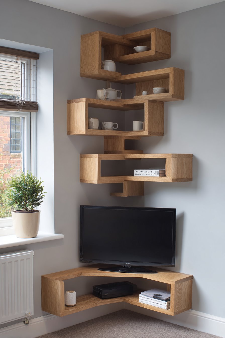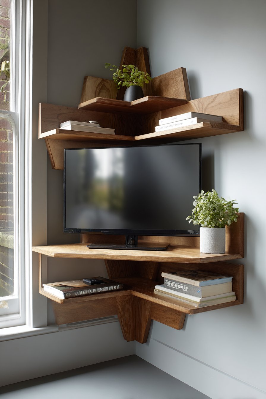 This design proves that spatial constraints can inspire creative solutions rather than limiting possibilities. The corner mounting actually creates better viewing angles from multiple seating positions in a small room, while the geometric shelf arrangement adds visual interest that a standard flat wall installation might lack. Interior photography captures how the design optimizes challenging corner space while balanced natural lighting prevents shadows that could make the corner feel dark.