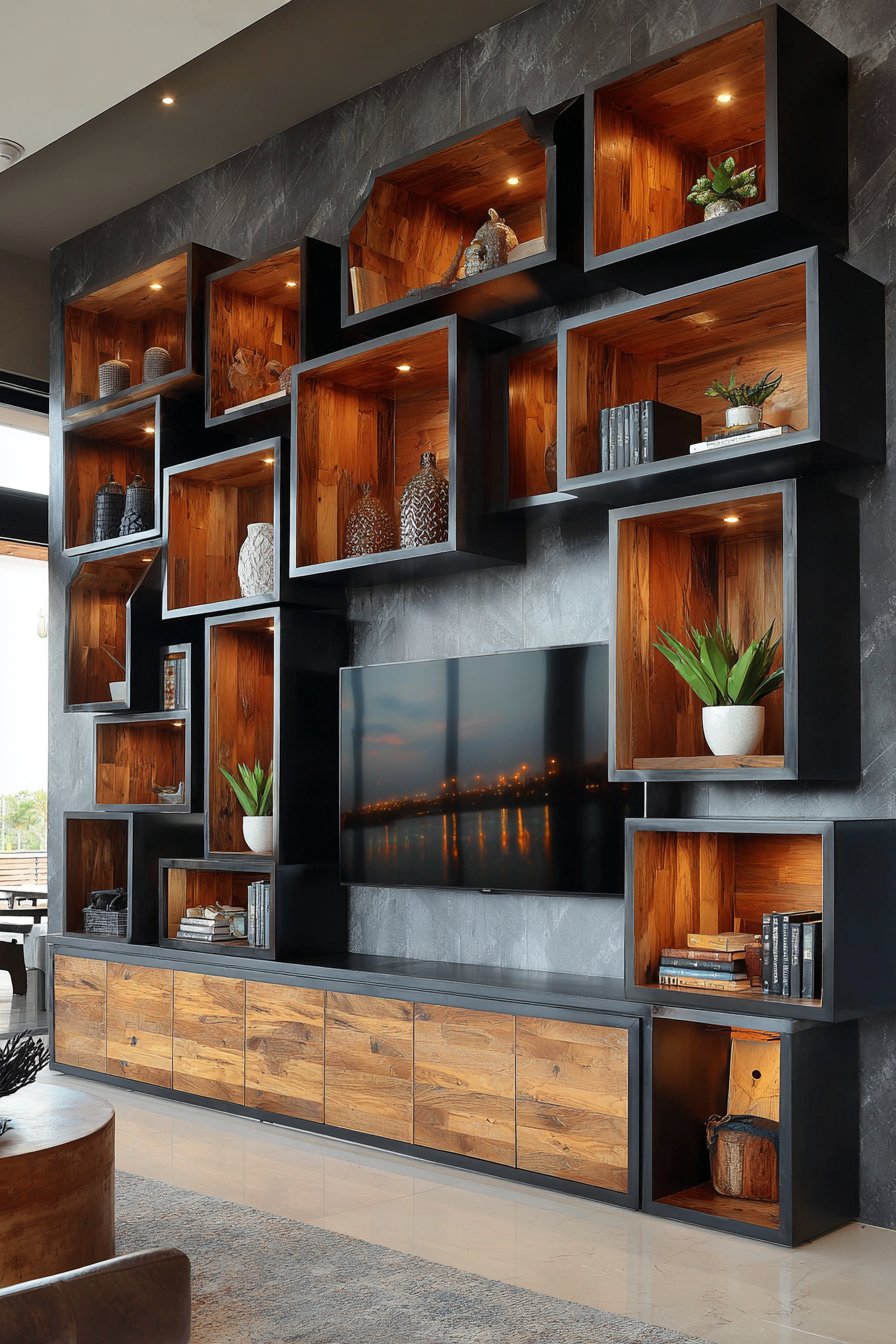 Integrated lighting within select cubes adds another layer of sophistication, highlighting displayed items and creating focal points that draw the eye through the composition. The asymmetrical arrangement feels intentional yet organic, as if the cubes have grown naturally across the wall rather than being rigidly placed. This flexibility allows you to adjust the configuration based on your storage needs and aesthetic preferences. The balanced exposure in professional interior photography captures how the interplay between dark framework and natural wood elements creates a dynamic yet harmonious whole.