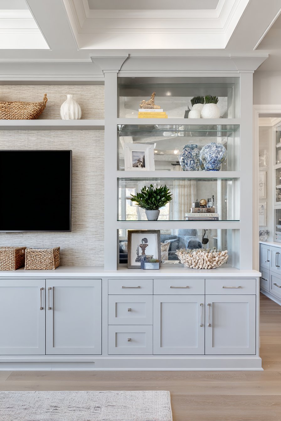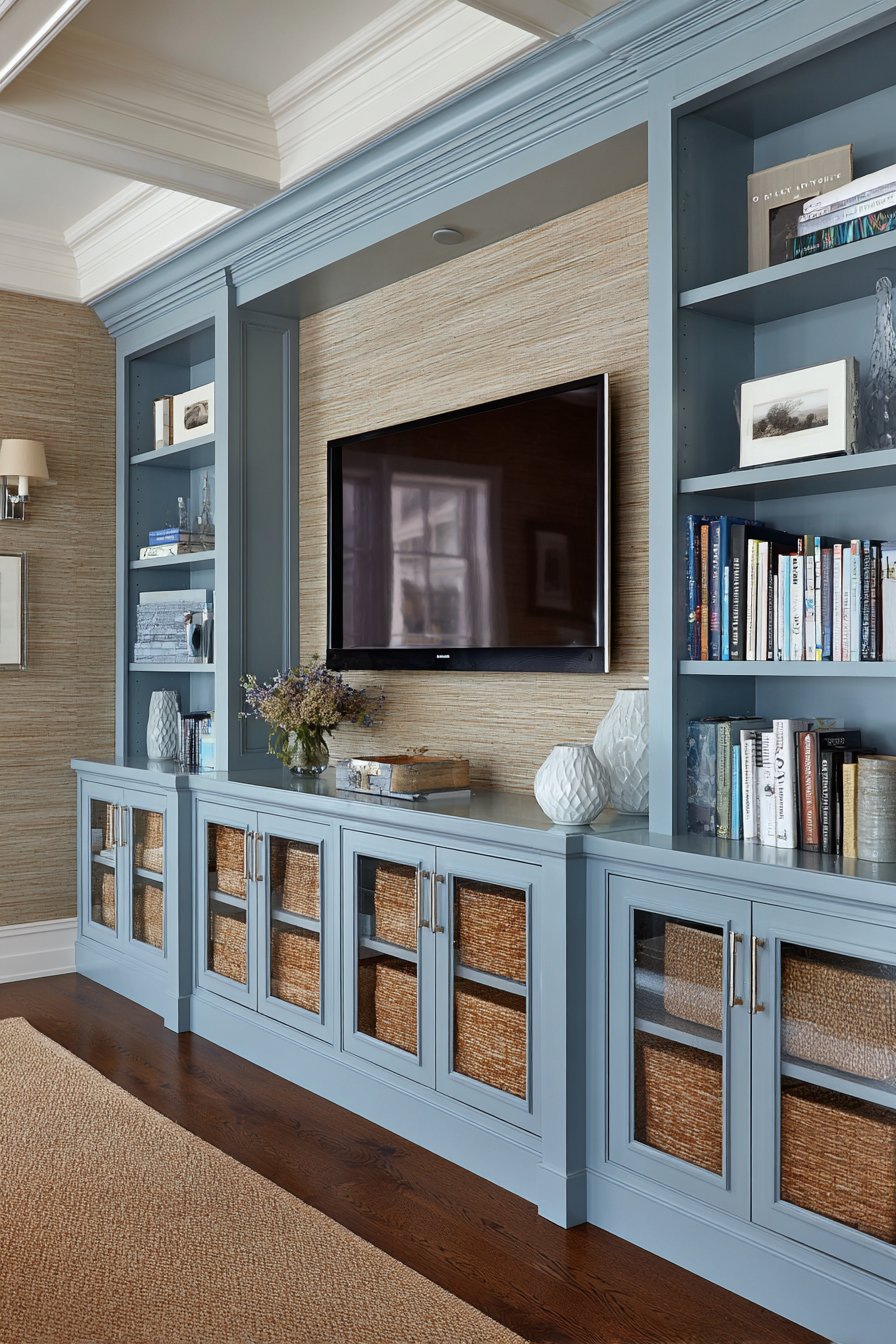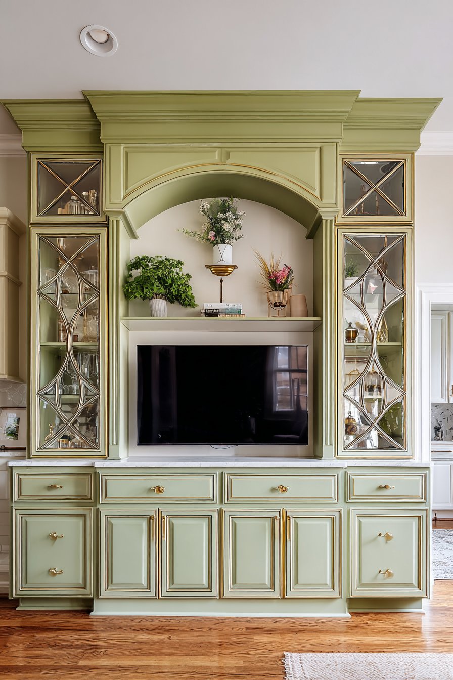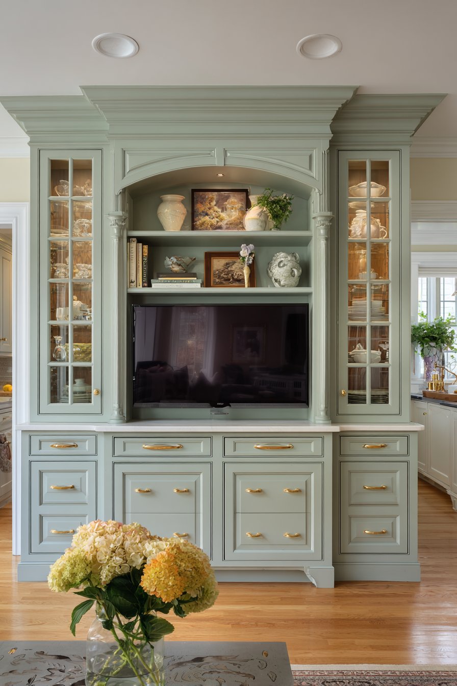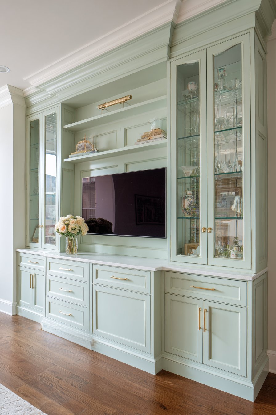 Sophisticated tradition meets contemporary color in this custom built-in media wall featuring floor-to-ceiling cabinetry in soft sage green. The centered television sits within a carefully proportioned recessed niche, framed by symmetrical closed storage cabinets below and glass-front display shelving above. This balanced, formal arrangement creates architectural presence and transforms the media wall into a room’s focal point. The sage green finish offers a fresh alternative to traditional wood tones while maintaining the refined character expected of built-in cabinetry.