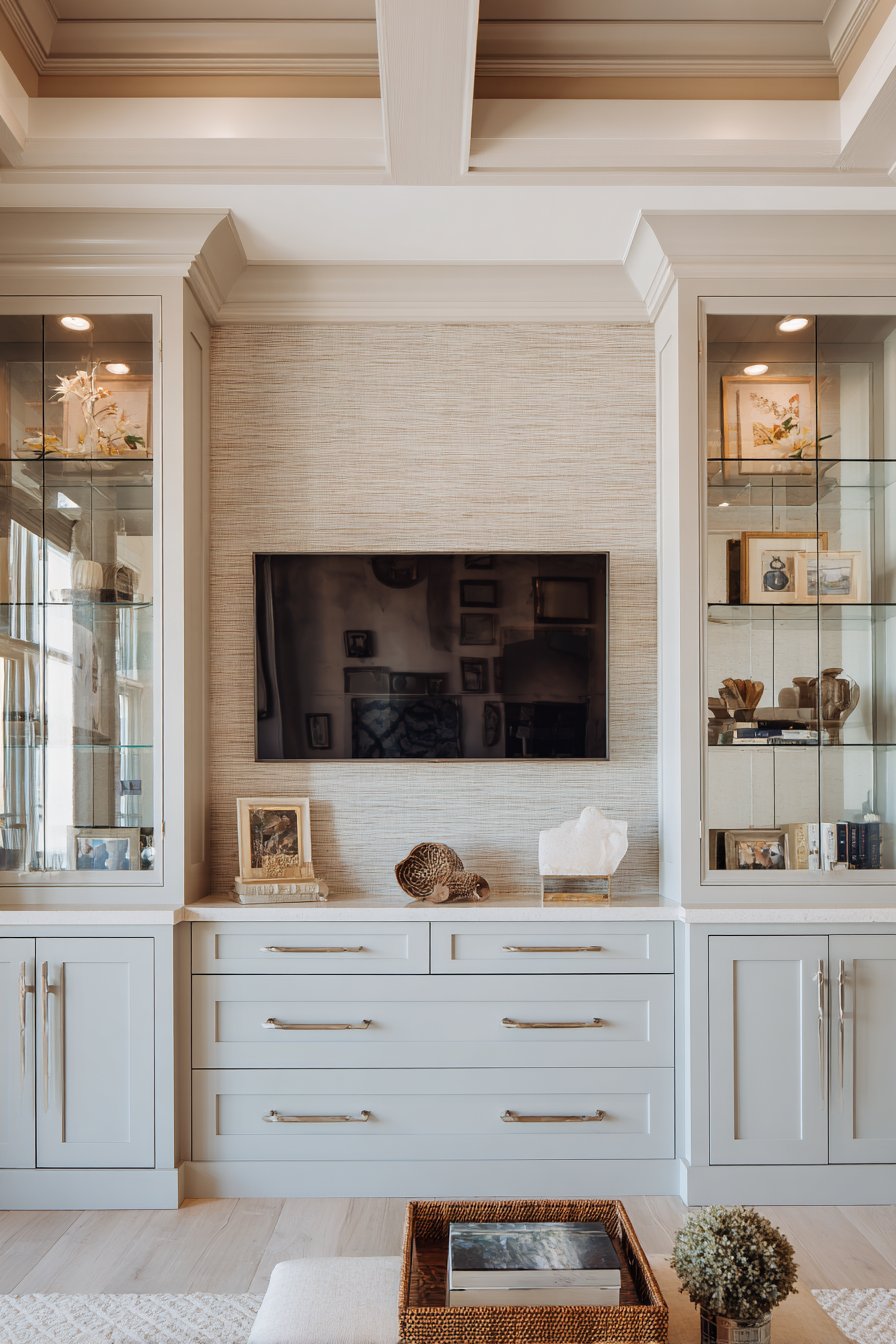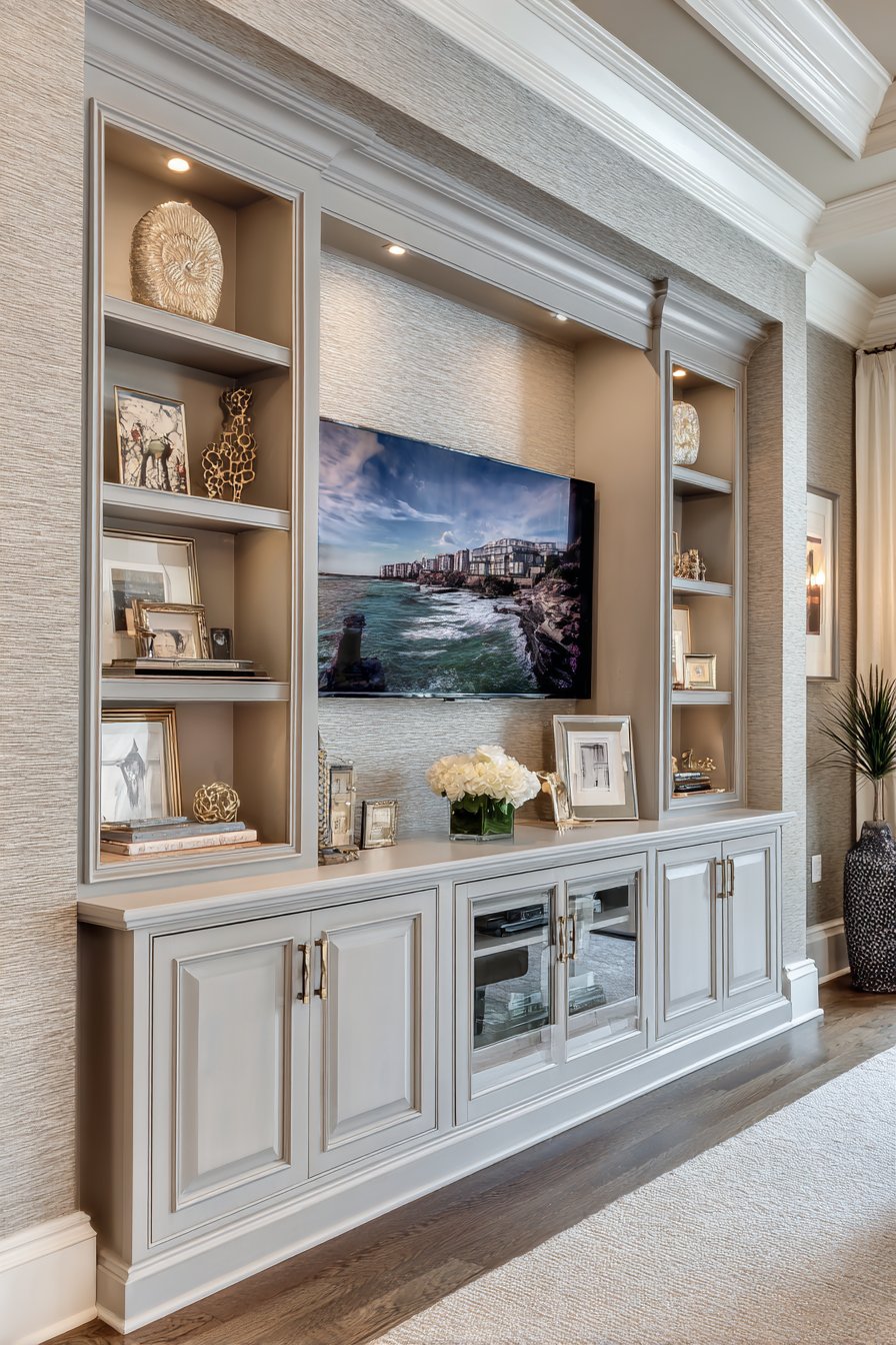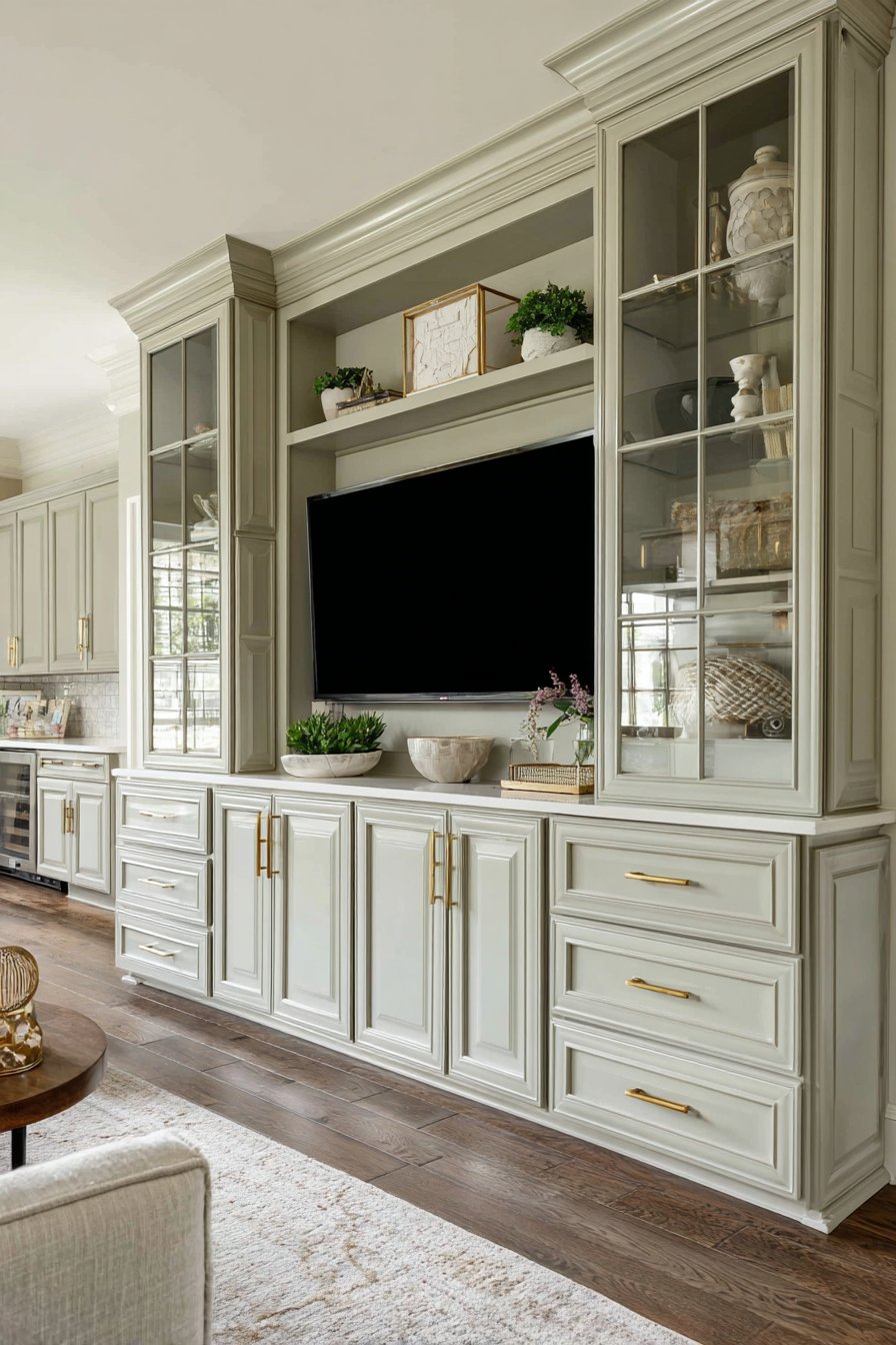 Crown molding and detailed trim work add architectural gravitas, connecting the built-in unit to the room’s existing millwork and creating a sense that the media wall has always been part of the home’s design. The soft sage green serves as a sophisticated neutral that works with both warm and cool color schemes, while the combination of open and closed storage allows you to display beautiful items while concealing less attractive necessities. Professional interior photography with soft diffused lighting captures how the traditional elegance and sophisticated color choice create a media wall that feels both timeless and fresh.