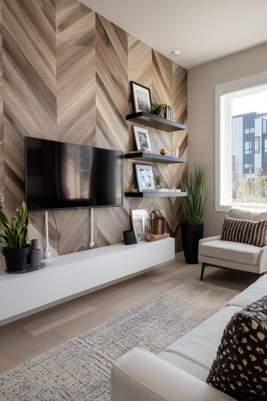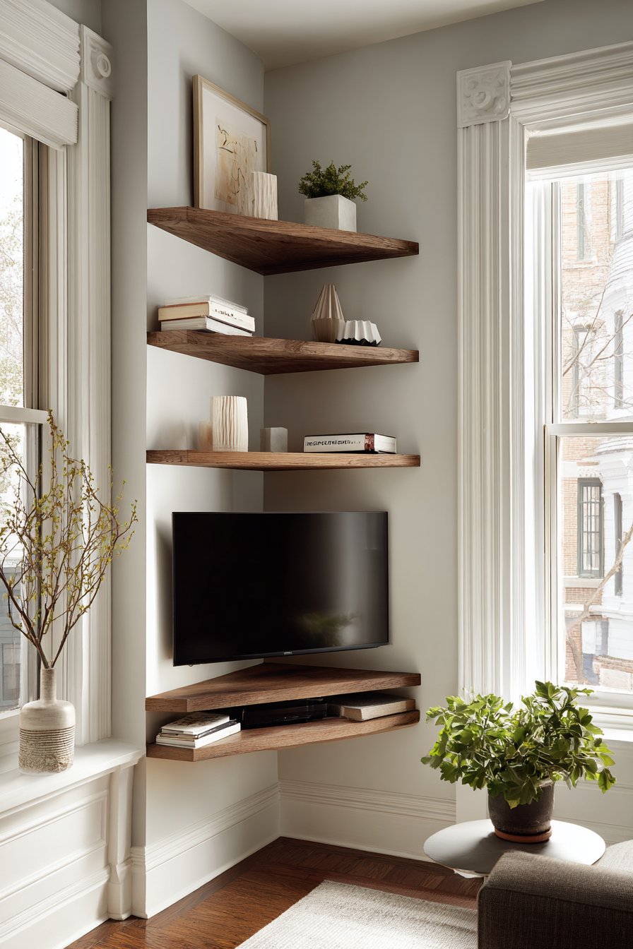 Maximize every inch of available space with this clever corner media wall designed for small apartments and compact rooms. The corner-mounted television makes ingenious use of often-wasted angular space, while custom floating shelves follow the wall’s geometry to create integrated storage and display areas. This approach transforms an awkward corner into a functional entertainment center that feels intentional rather than compromised. The angular shelves add architectural interest while providing practical surfaces for a media streaming device, a few carefully chosen books, and minimal decorative accents.