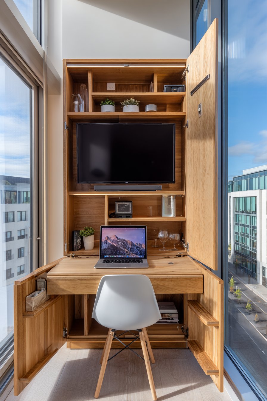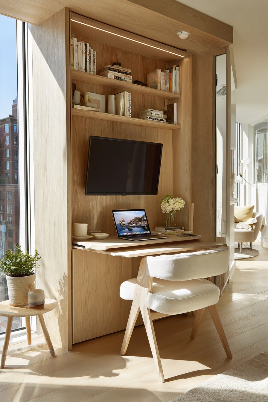 Wide-angle interior design photography demonstrates how space-saving solutions can look stylish while solving practical challenges. The fold-down desk provides a proper workspace without requiring a separate desk that would crowd the room. Storage cubbies keep small apartment essentials organized and accessible. Natural light from a nearby window supplements the LED task lighting. This proves that small space living doesn’t mean sacrificing style or function.