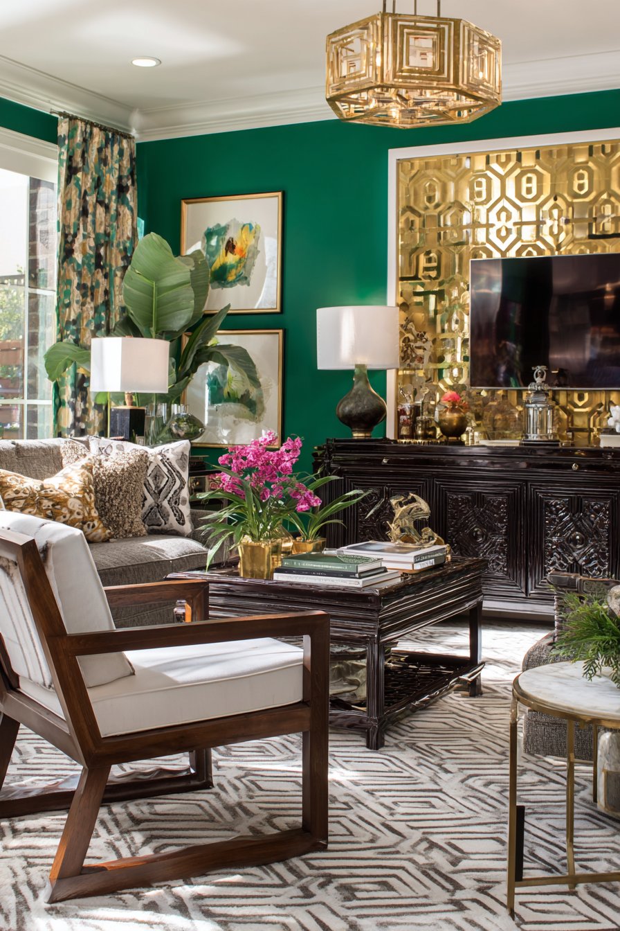Professional interior photography capturing the bold layered aesthetic requires careful exposure management to maintain detail in both dark and light areas while accurately rendering the saturated emerald color. This approach appeals to maximalists, collectors, and those who view more as more. The result is a space that feels deeply personal, visually stimulating, and unapologetically abundant.