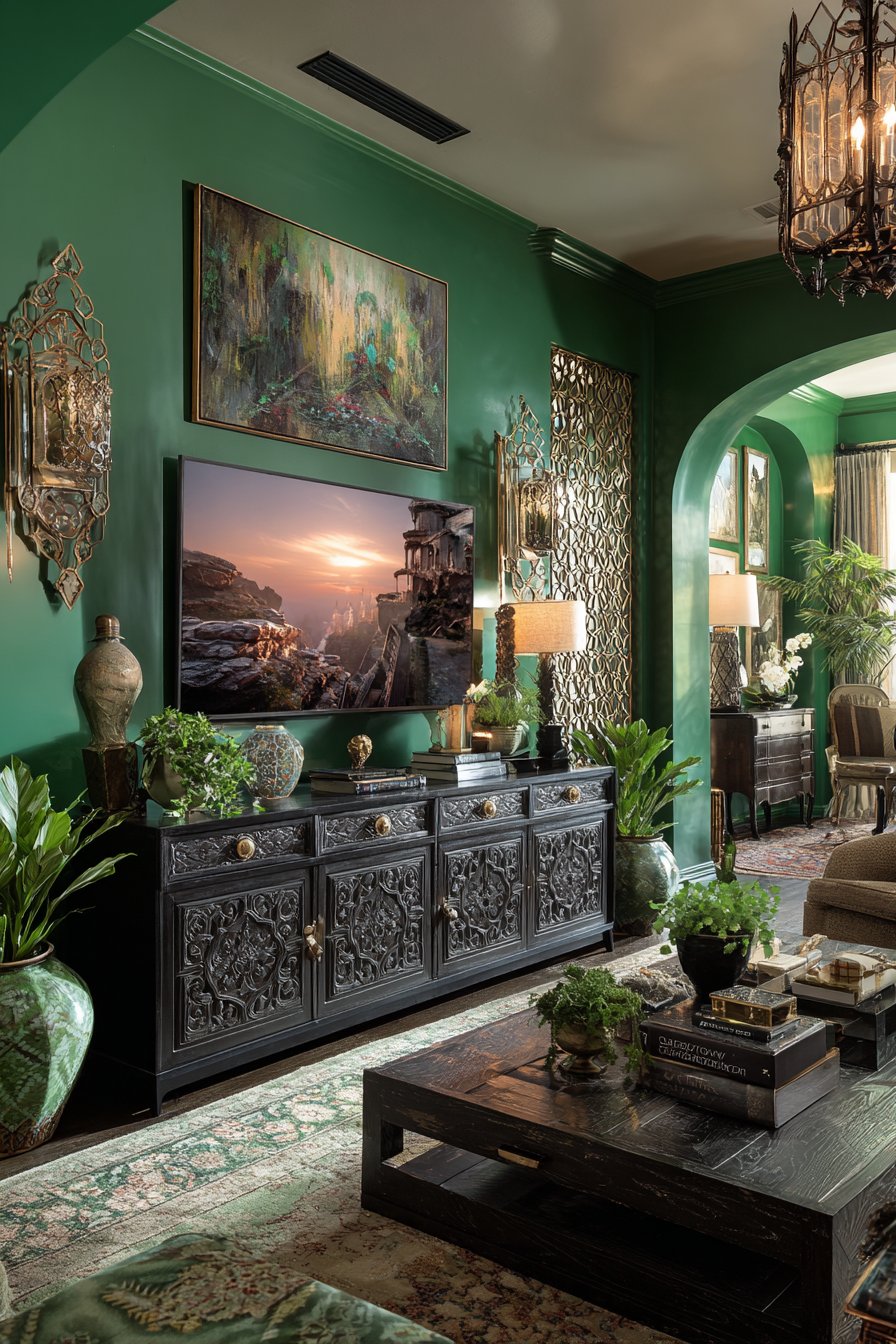 The media console features intricate carved details in dark finish with decorative brass handles that add jewelry-like detail. Multiple decorative objects, stacks of art books, and plants create abundant visual interest across every surface. This isn’t minimalism—it’s the opposite, celebrating collected treasures and layered decoration. Multiple lighting sources including a statement chandelier, decorative sconces, and accent lights create rich, adjustable ambiance.