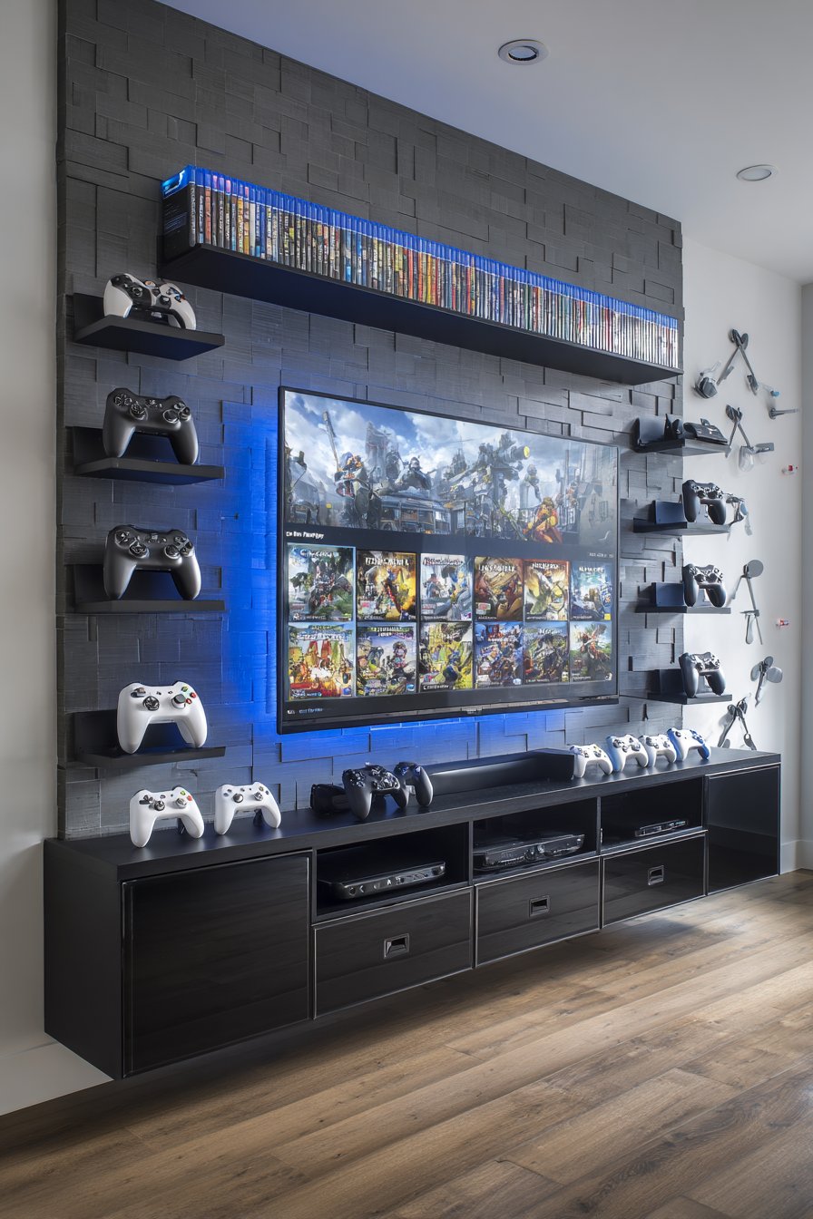 Create the ultimate gaming environment with this specialized media wall featuring RGB LED strip lighting that changes colors to match on-screen content, creating an immersive viewing experience. The lighting mounts behind the television and around floating shelves, responding dynamically to game action. The custom gaming setup includes dedicated display shelves for console collections arranged chronologically or by preference, controller charging stations that keep devices powered and organized, and headphone hangers that prevent cord tangling.