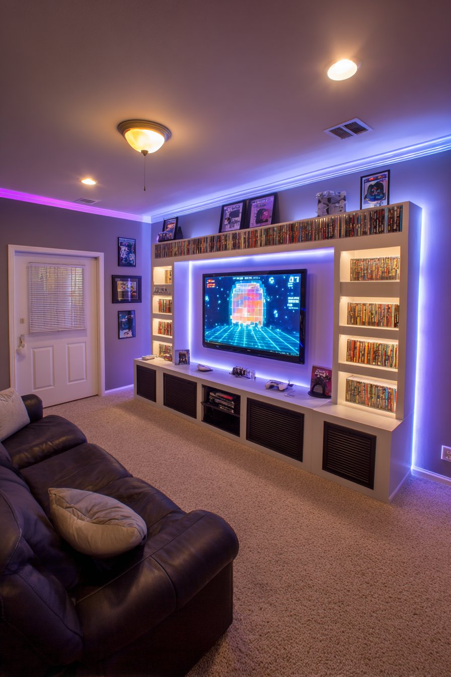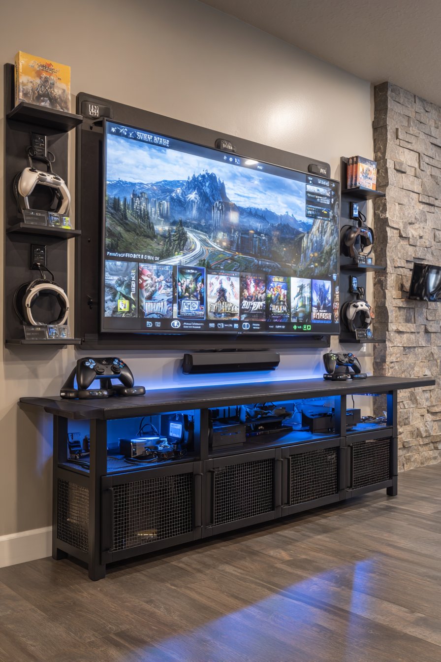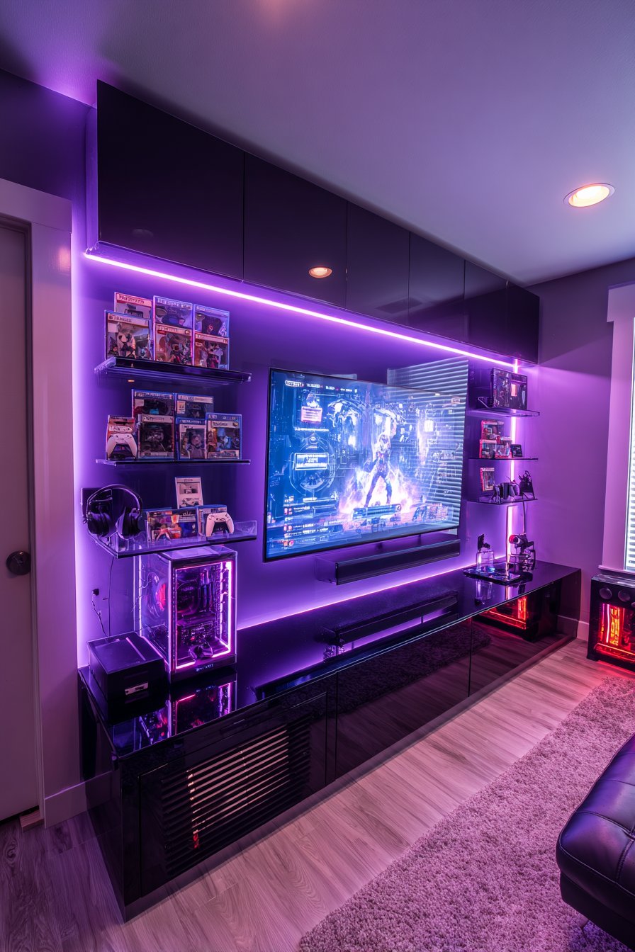 Cable management channels keep numerous gaming-related wires organized without visible chaos—essential when multiple consoles, controllers, and accessories require connectivity. A sleek black media console with ventilated compartments prevents equipment overheating during extended gaming sessions, while internal organization systems keep games and accessories accessible but neat. Professional interior photography captures the immersive lighting effects while maintaining clear view of the functional gaming organization system.