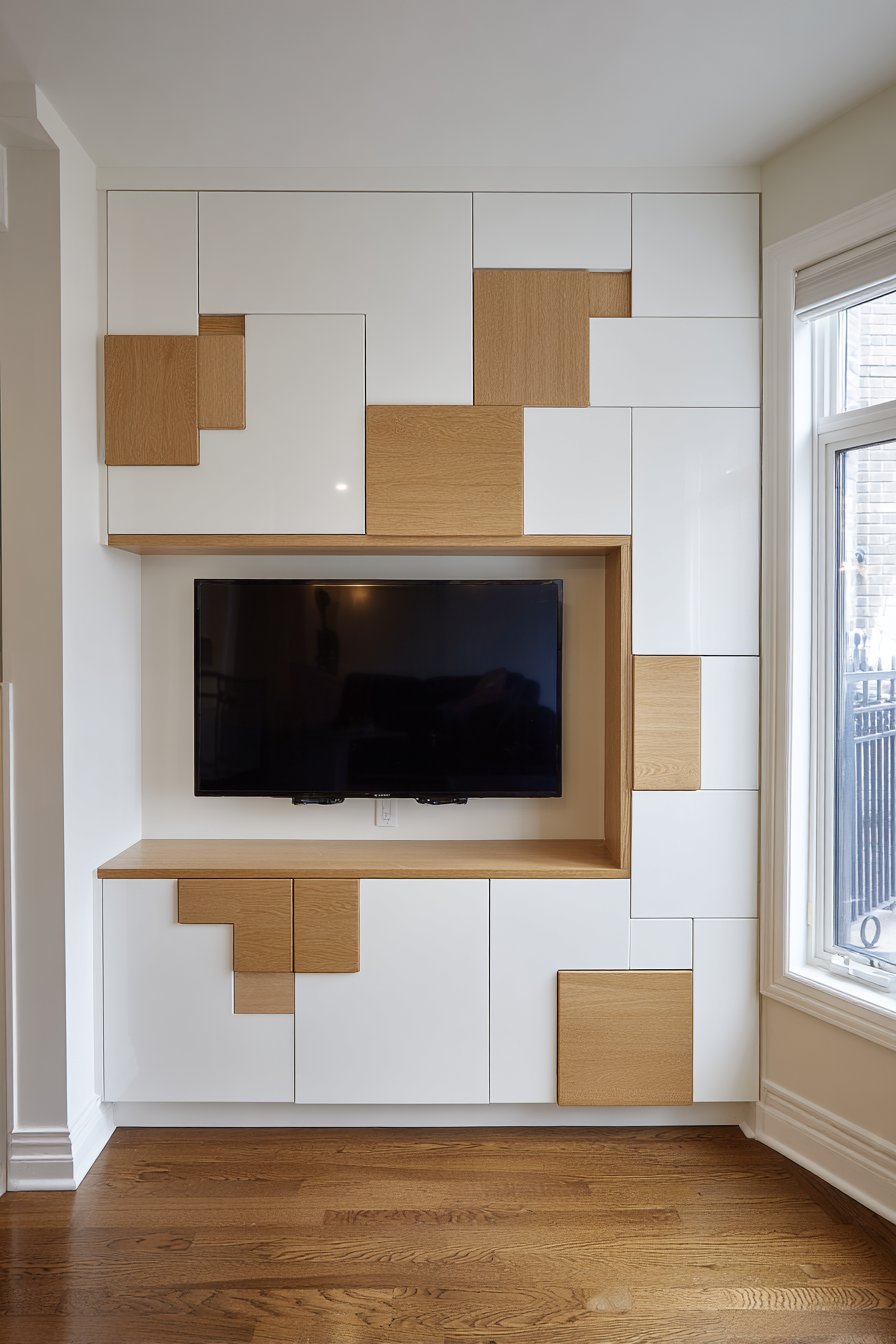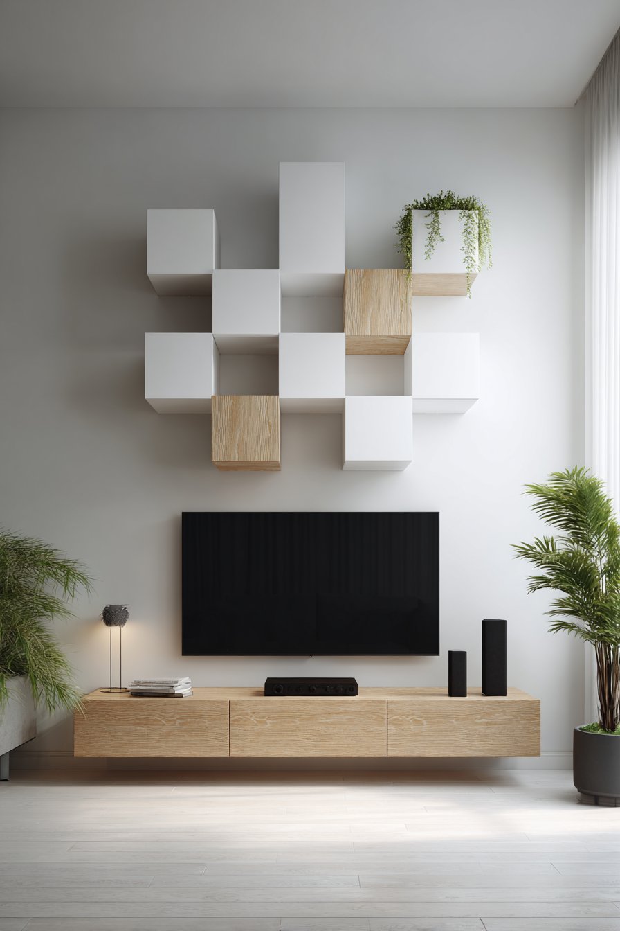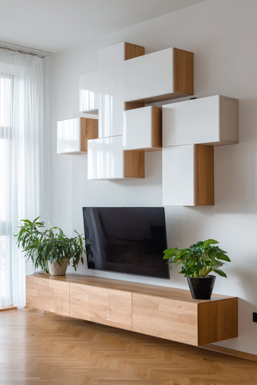 The television mounts to the wall with the modular units arranged around it in an asymmetric contemporary pattern that can be reconfigured when needs change. Perhaps you need more closed storage now but anticipate needing display space later—the modular system adapts. Adding, subtracting, or rearranging units takes minutes rather than requiring renovation. This versatile solution works across various life stages and housing situations.