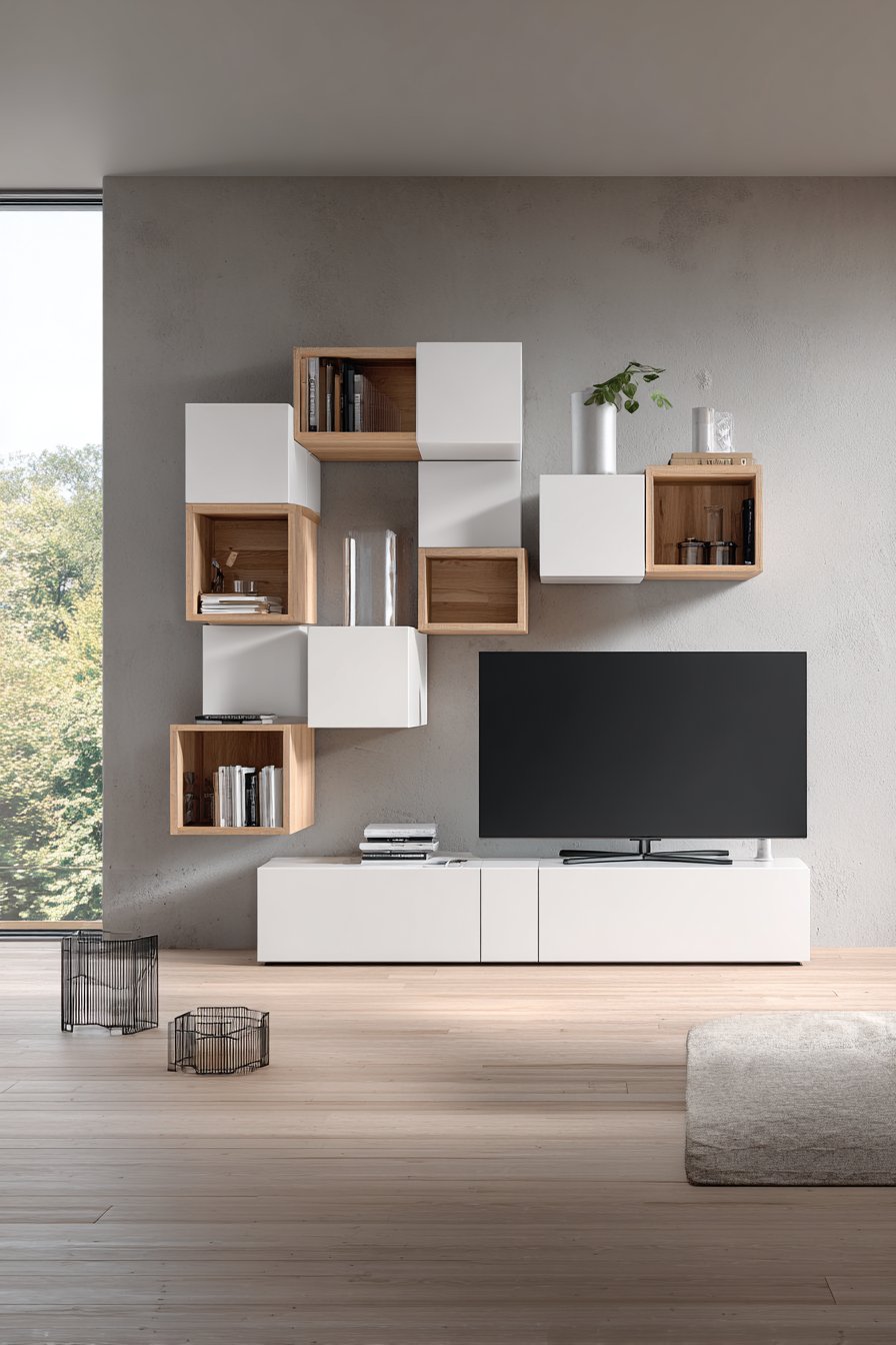 Embrace adaptability with this flexible modular media wall using customizable cube storage systems that rearrange based on changing needs. Individual units in matte white and natural oak finish stack and configure differently as life evolves—perfect for renters, growing families, or anyone who values flexibility. Some cubes contain doors for concealed storage, some remain open for display, and some fit with media equipment.