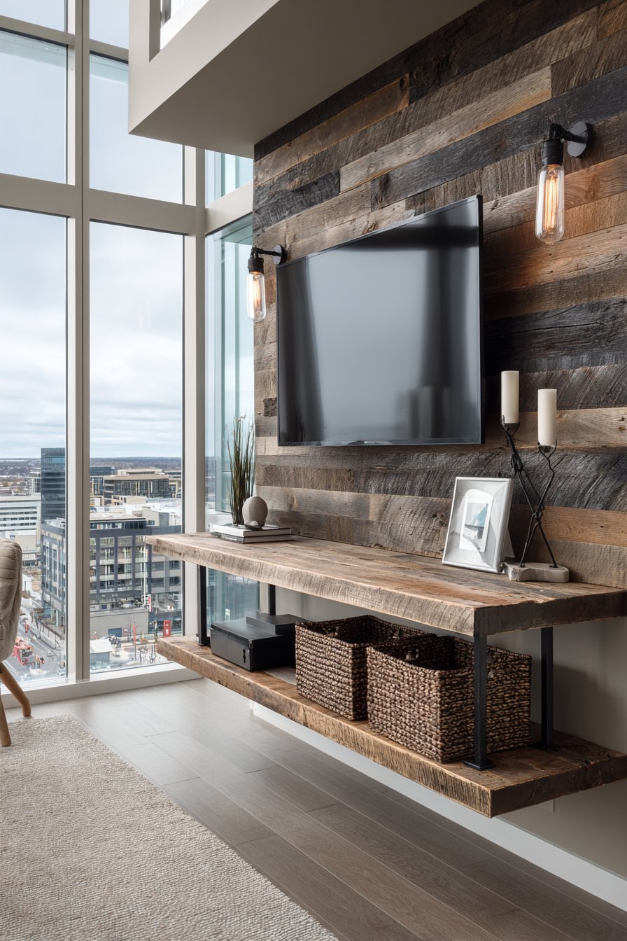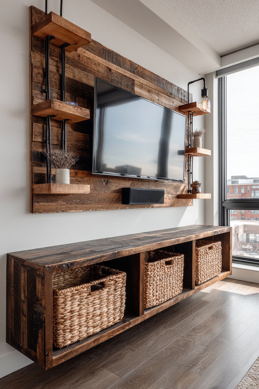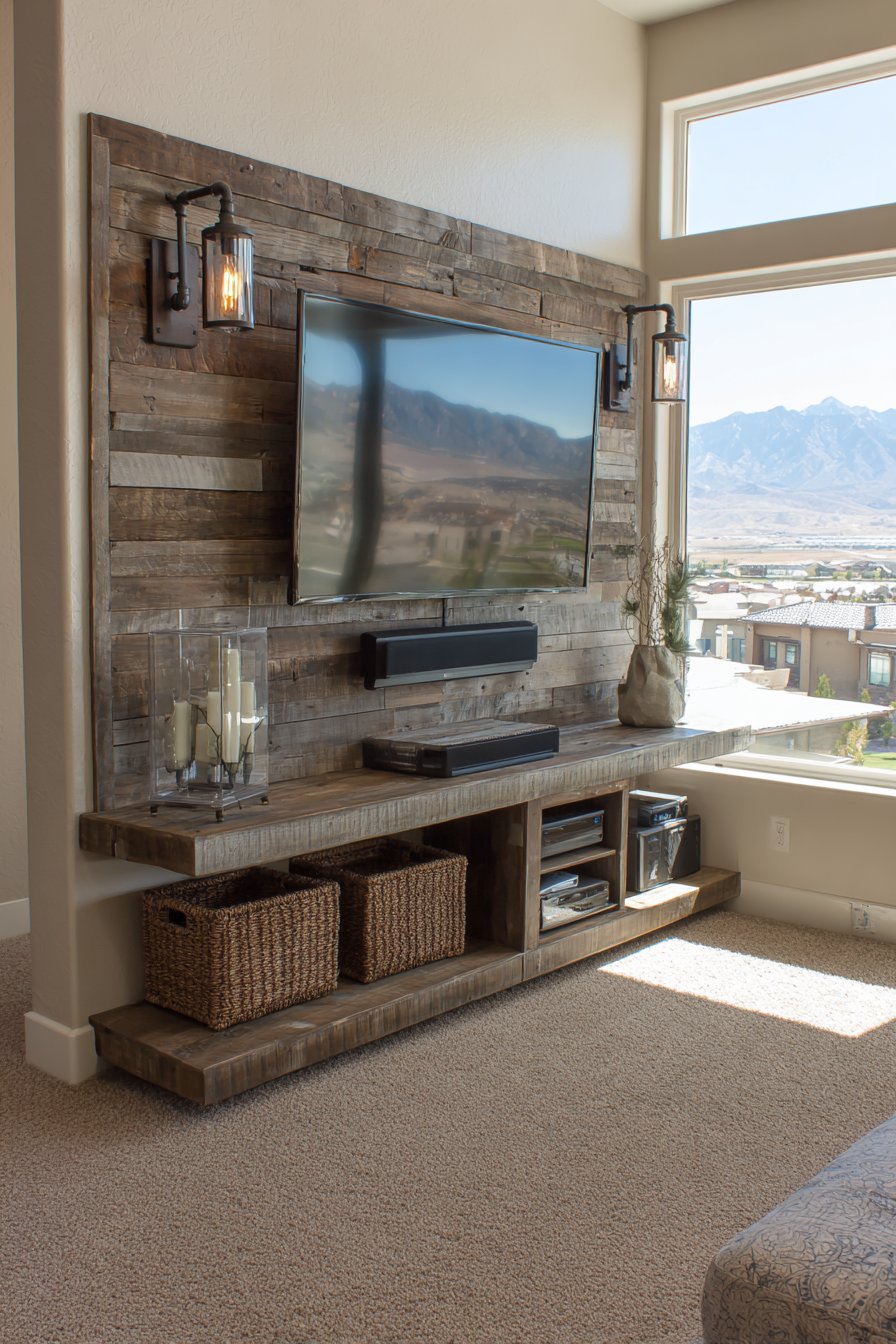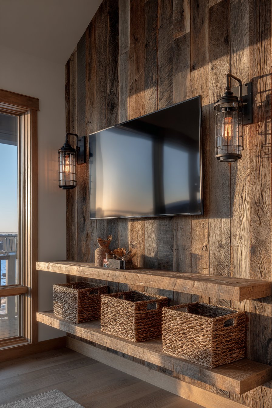 A chunky floating shelf constructed from matching reclaimed lumber sits below the television, its substantial proportions and visible saw marks emphasizing the rustic aesthetic. Industrial-style pipe brackets support the shelf, their raw metal finish and utilitarian form adding to the authentic industrial-rustic fusion. Woven storage baskets tucked onto the shelf provide concealed storage for remotes, gaming controllers, and other accessories while introducing natural fiber textures that complement the wood. Warm Edison bulb sconces flanking the television cast a golden glow that emphasizes the wood grain and creates inviting ambiance for evening viewing.