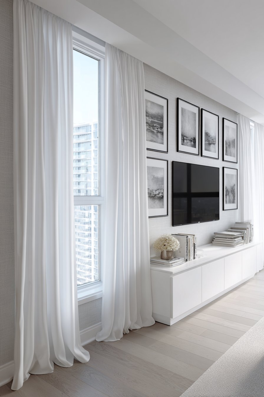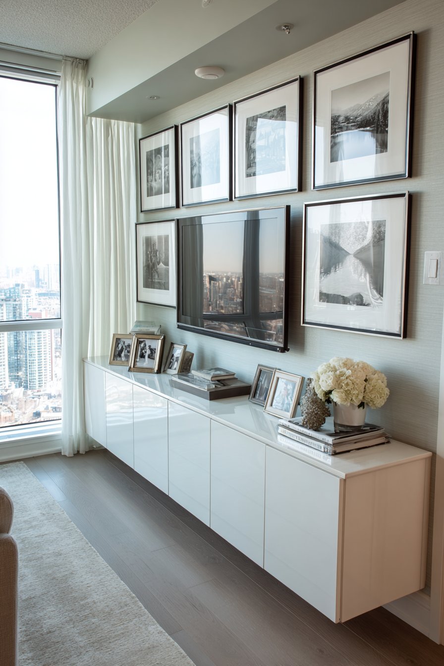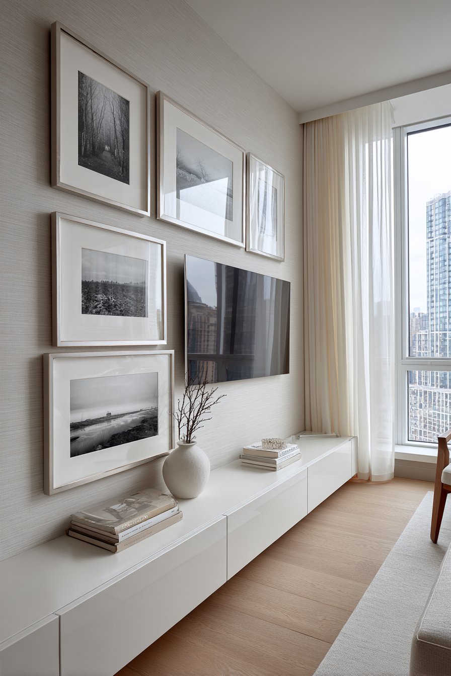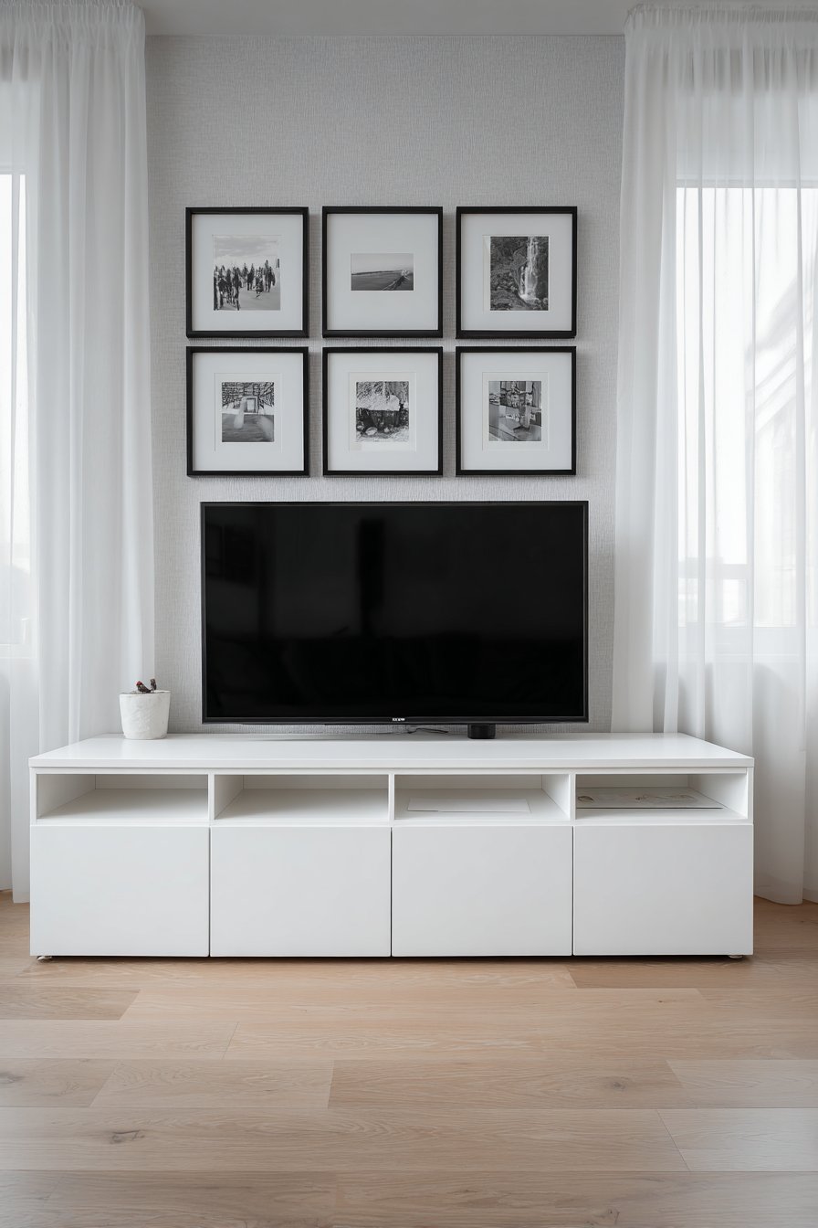 Nordic design principles shine in this serene media wall that embodies the Scandinavian philosophy of functional beauty. A low-profile media console in pristine white lacquer sits cleanly against a soft grey textured wall, its hidden storage compartments maintaining the uncluttered appearance that defines this aesthetic. The console’s clean lines and handleless doors create a seamless surface interrupted only by subtle push-to-open mechanisms. Above, a simple mounted television becomes part of a carefully considered gallery wall arrangement featuring black and white photography in slim black frames.