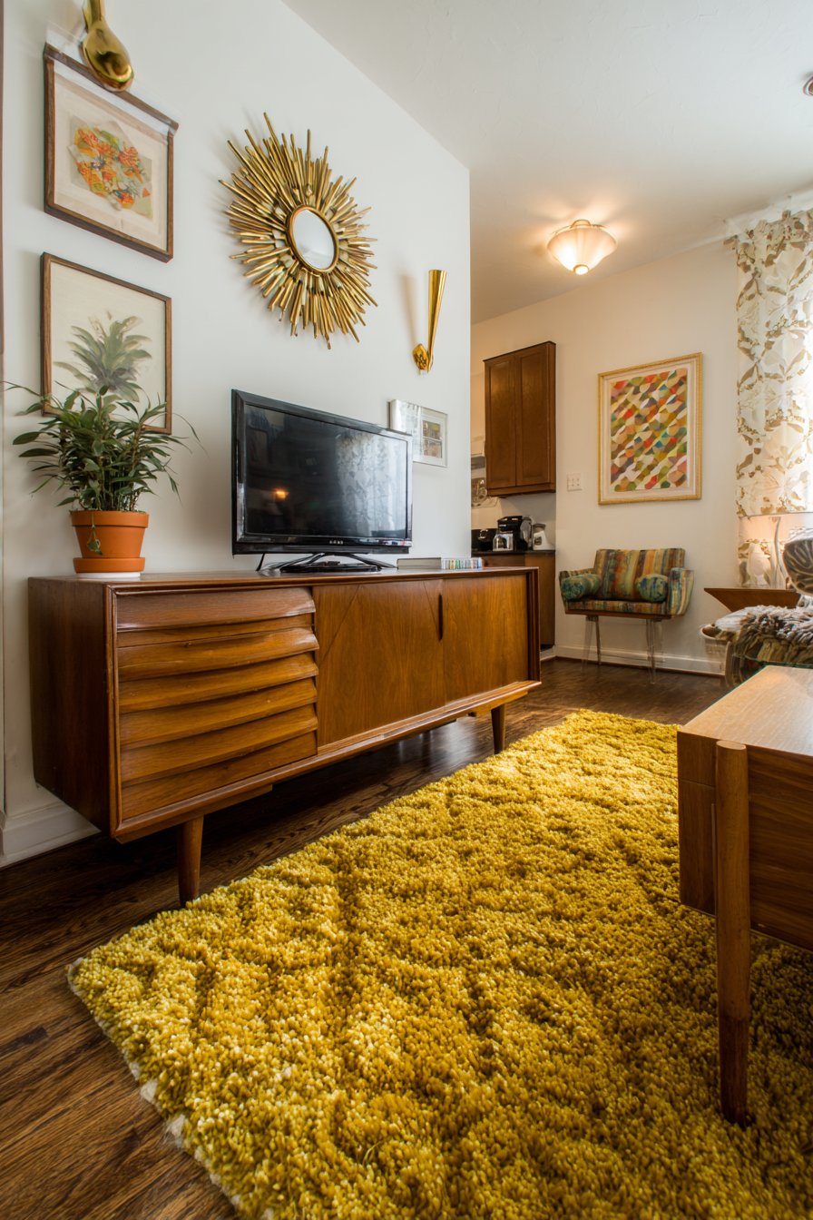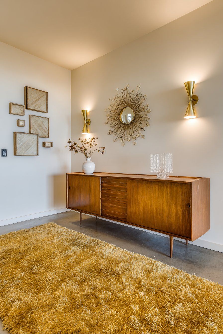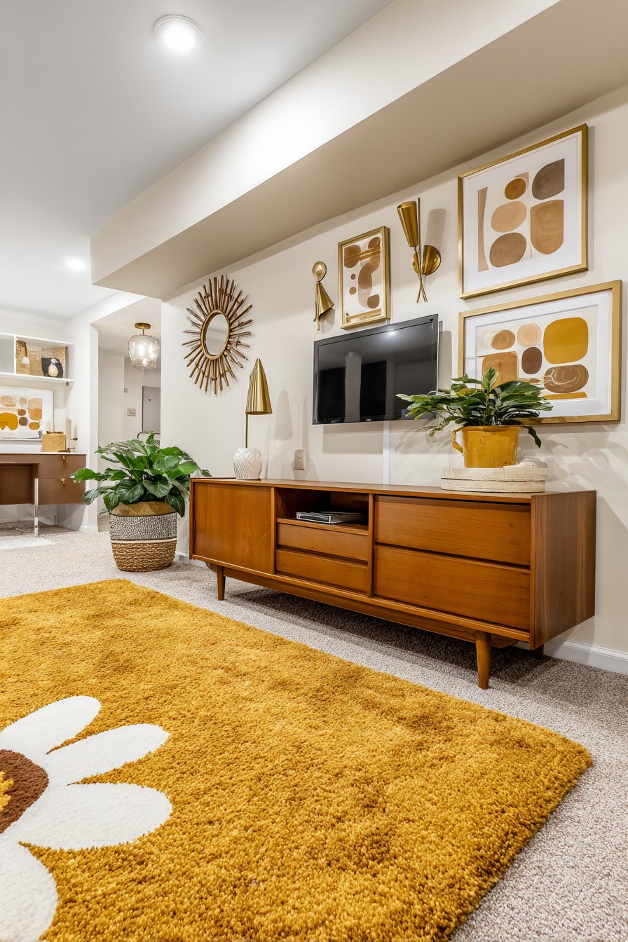 Abstract geometric art pieces flanking the television create a curated gallery arrangement that celebrates mid-century’s love of bold forms and colors. The surrounding wall painted in warm off-white provides a neutral backdrop that allows the wood tones and art to shine. Brass cone-shaped wall sconces add both functional and decorative lighting, their metallic finish and sculptural form perfectly capturing the period’s aesthetic. Below, a shag area rug in authentic mustard yellow anchors the space and adds textural contrast to the smooth wood surfaces.