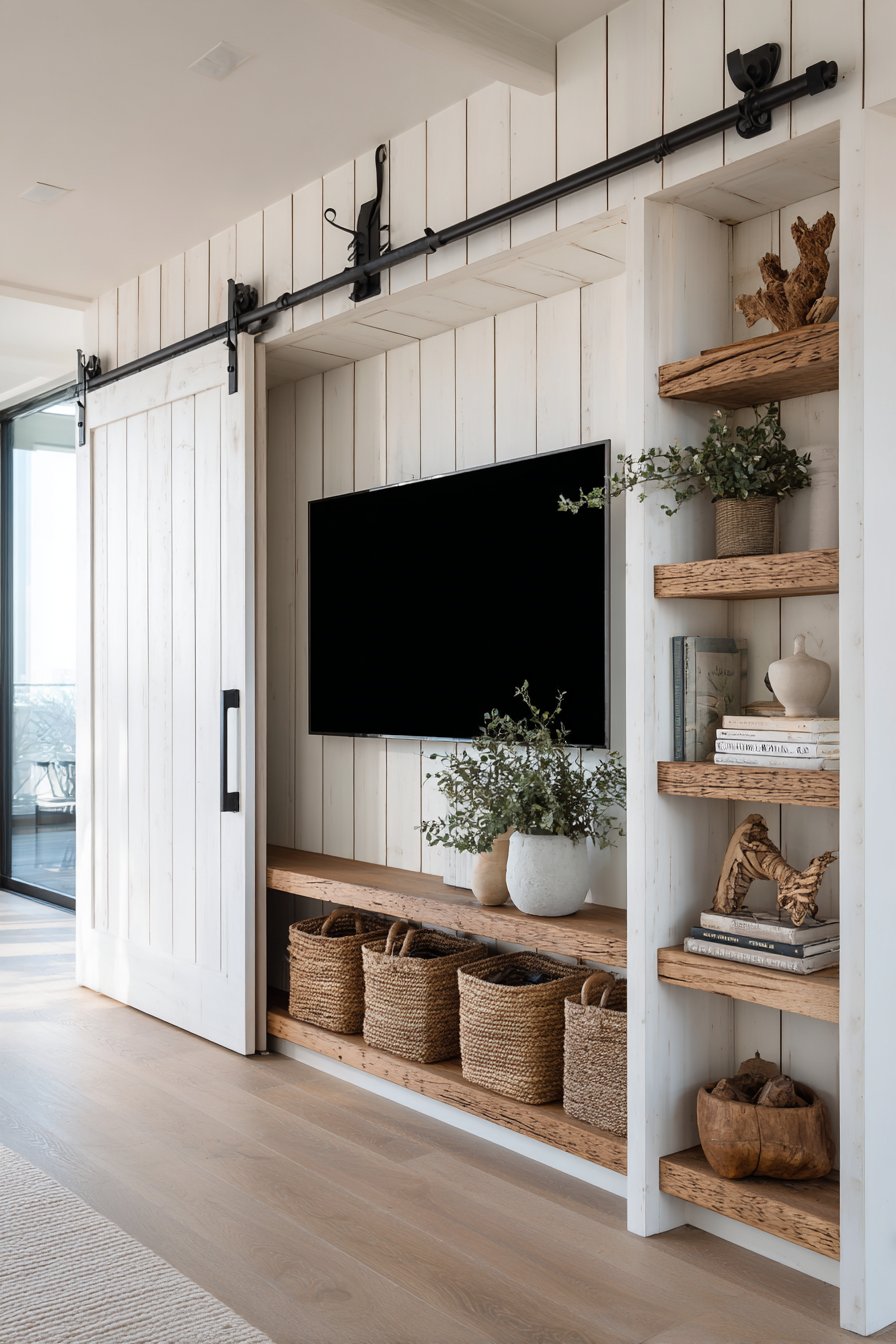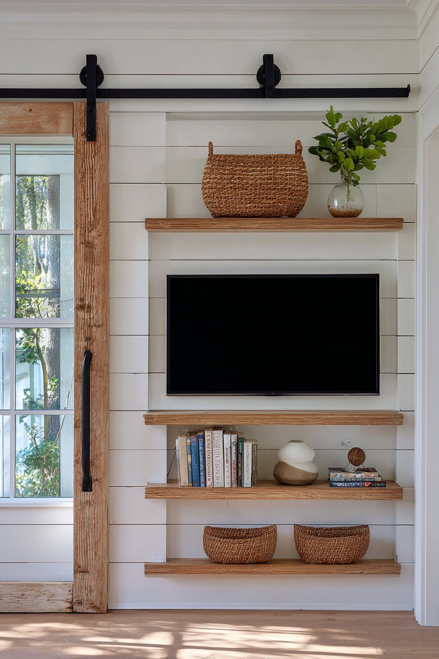 Rustic charm meets practical function in this farmhouse media wall featuring crisp white shiplap paneling that creates a classic backdrop. The genius of this design lies in the rustic sliding barn door that conceals the television when not in use, transforming the media wall into a decorative focal point that doesn’t announce its technological purpose. The exposed black metal hardware and track provide visual interest while demonstrating the functional beauty that defines farmhouse style.