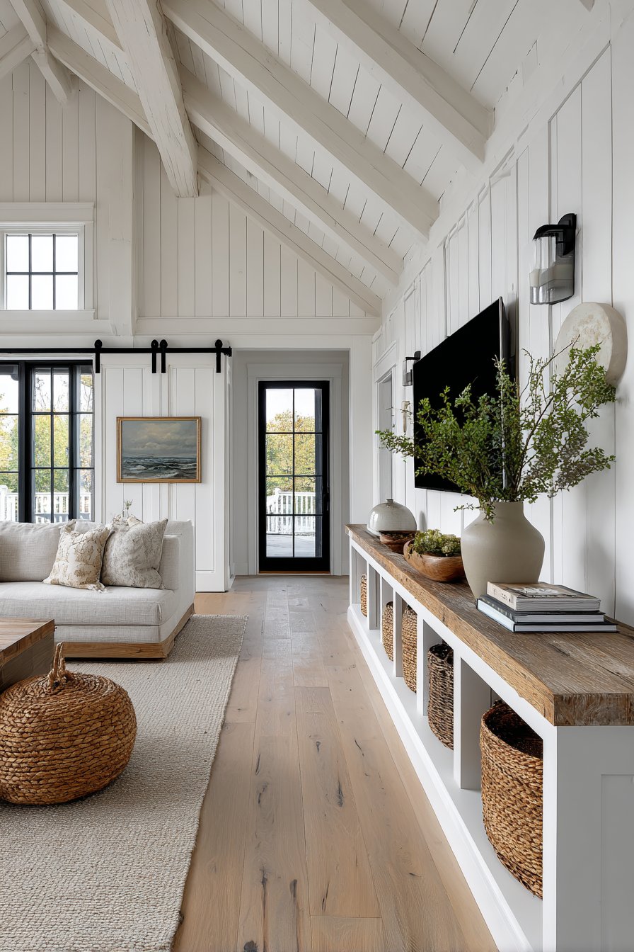 Open shelving constructed from thick pine boards with visible knots flanks the barn door, providing display space for woven baskets that offer concealed storage, vintage books with worn spines that add character, and simple greenery in white ceramic vessels. The natural wood grain and rustic imperfections in the pine boards create warmth and texture against the painted shiplap. This is design that celebrates handcrafted quality and the beauty of natural materials—nothing feels mass-produced or generic.
