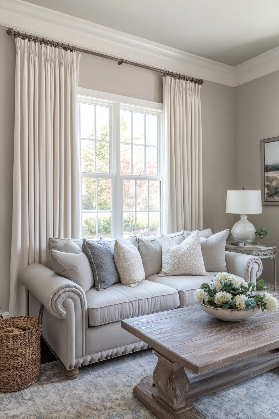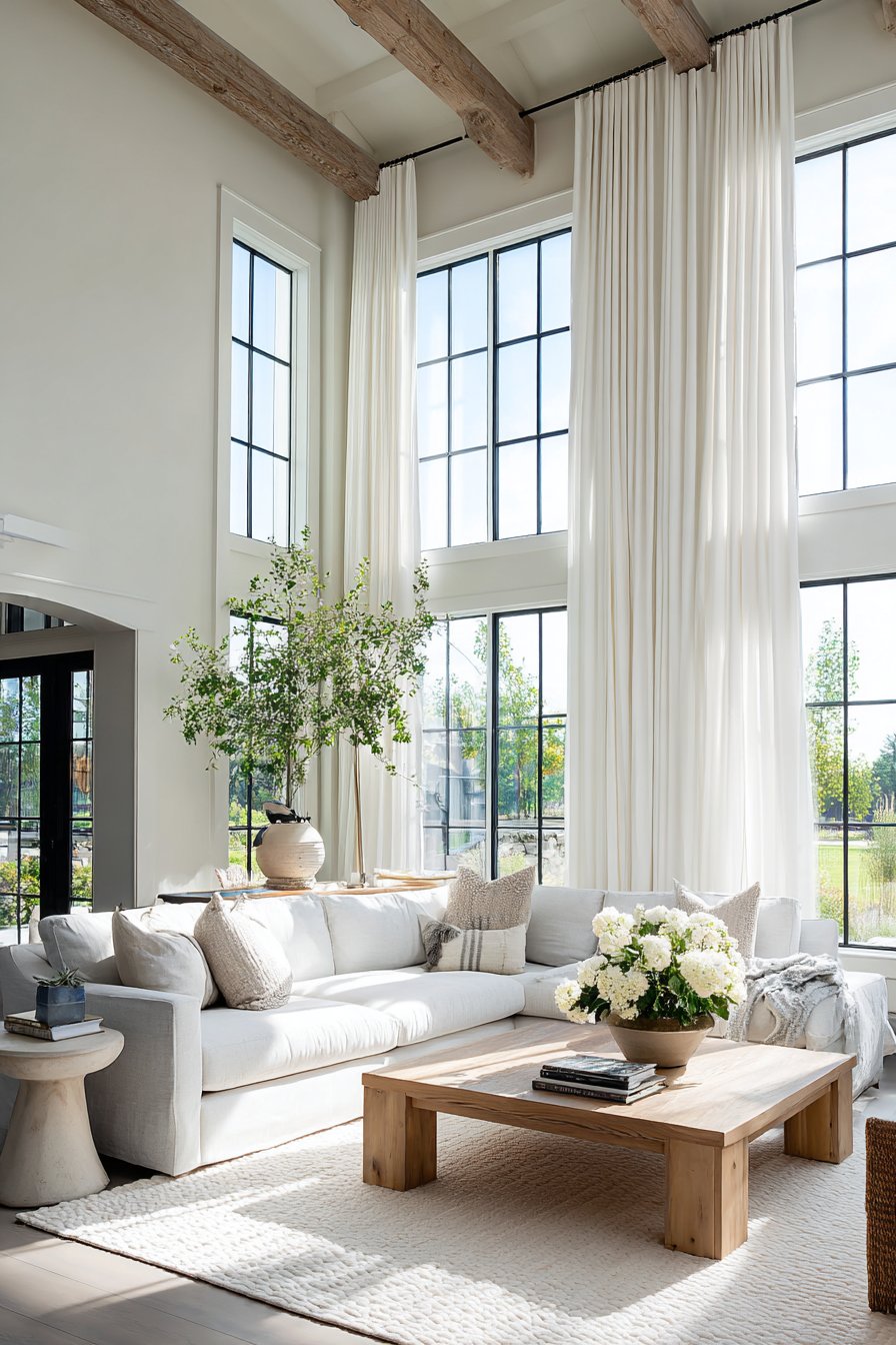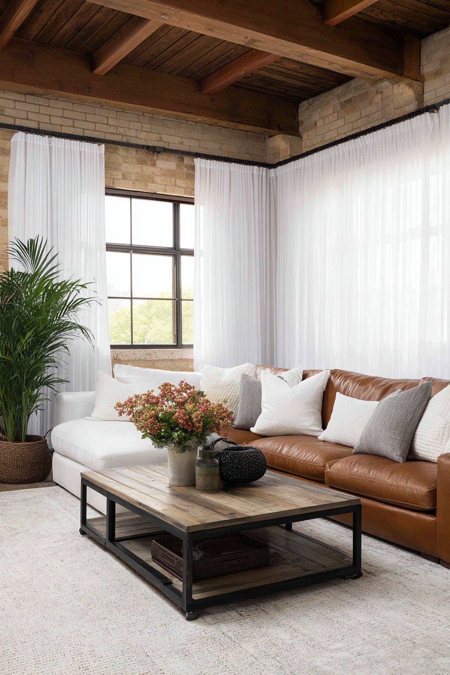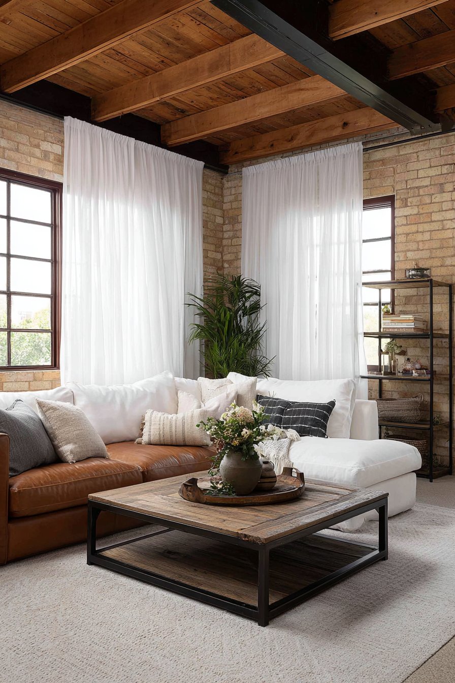 The success of this design lies in its ability to feel both polished and approachable. The white linen curtains provide the polished element, their floor-length elegance elevating the space, while the rustic furniture and casual fabric treatment keep the room from feeling too precious. This balance allows the living room to function as a true gathering space where family and friends feel comfortable relaxing without worrying about perfection. The curtains’ natural wrinkles actually contribute to this welcoming atmosphere, signaling that this is a home meant for living, not a museum display.