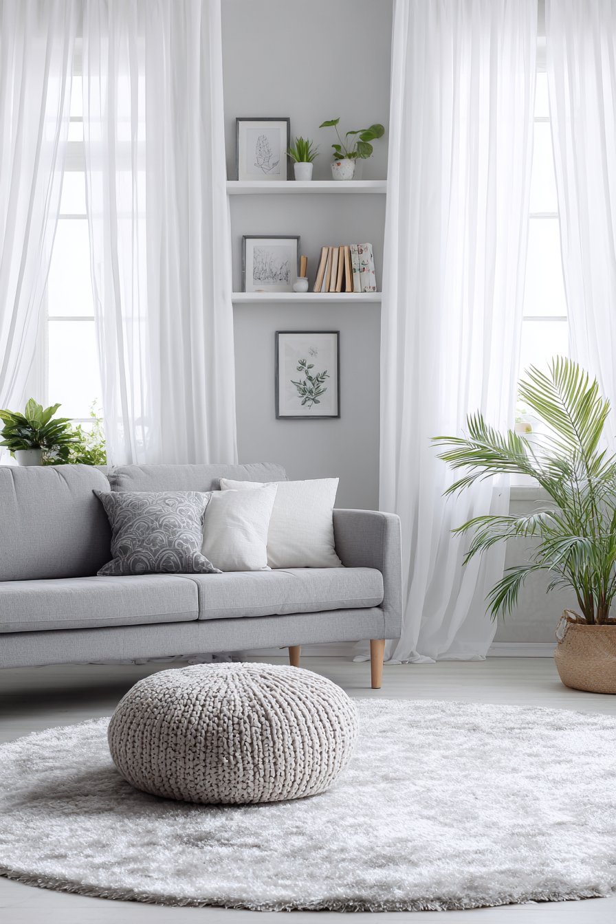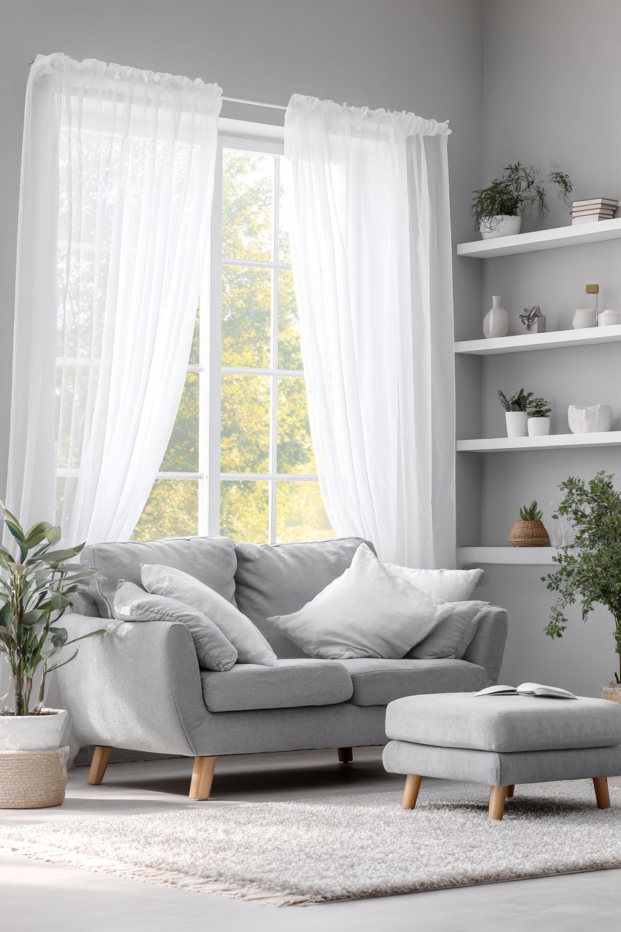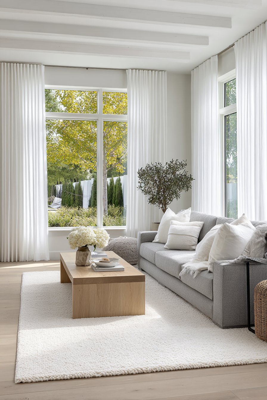 The curtains frame expansive windows that serve as the room’s primary light source, a fundamental principle in Scandinavian design where maximizing natural light compensates for long, dark winters. Beneath these flowing panels sits a minimalist grey sofa adorned with white throw pillows, its clean lines and neutral tones allowing the curtains to remain the focal point. A light oak coffee table rests on a cream wool rug, introducing natural wood tones that ground the ethereal quality of the white textiles. The interplay between soft fabrics and solid wood creates the balanced harmony that defines hygge—the Danish concept of cozy contentment.