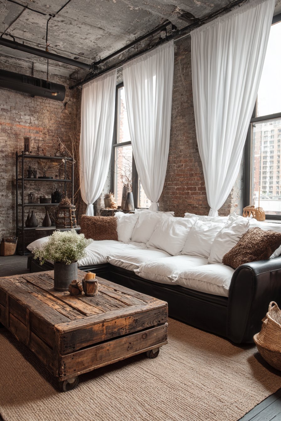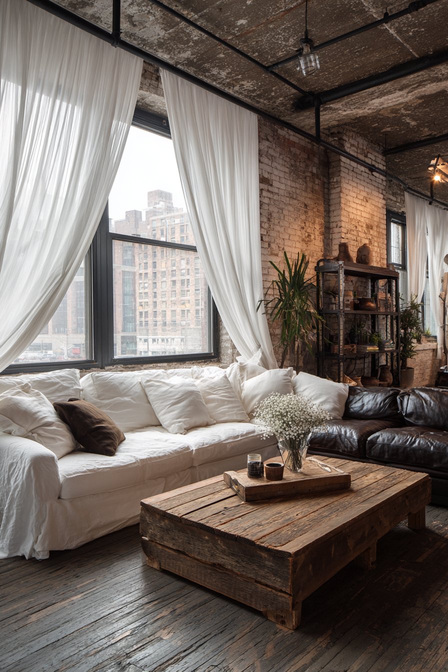 The urban living room embraces industrial authenticity with a rich brown leather sofa that will only improve with age and wear, developing the patina that makes leather furniture treasured possessions. A reclaimed wood coffee table with visible saw marks and natural imperfections provides surface area while honoring the industrial principle of celebrating materials’ honest qualities. Vintage metal shelving units, perhaps rescued from old factories or workshops, offer both storage and display opportunities while reinforcing the industrial aesthetic. Against these substantial, weighty elements, the white gauze curtains appear almost weightless, floating and ephemeral.