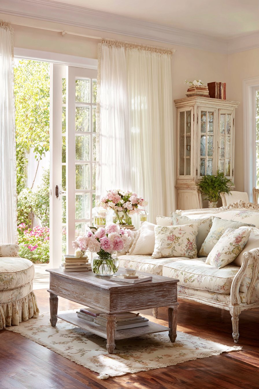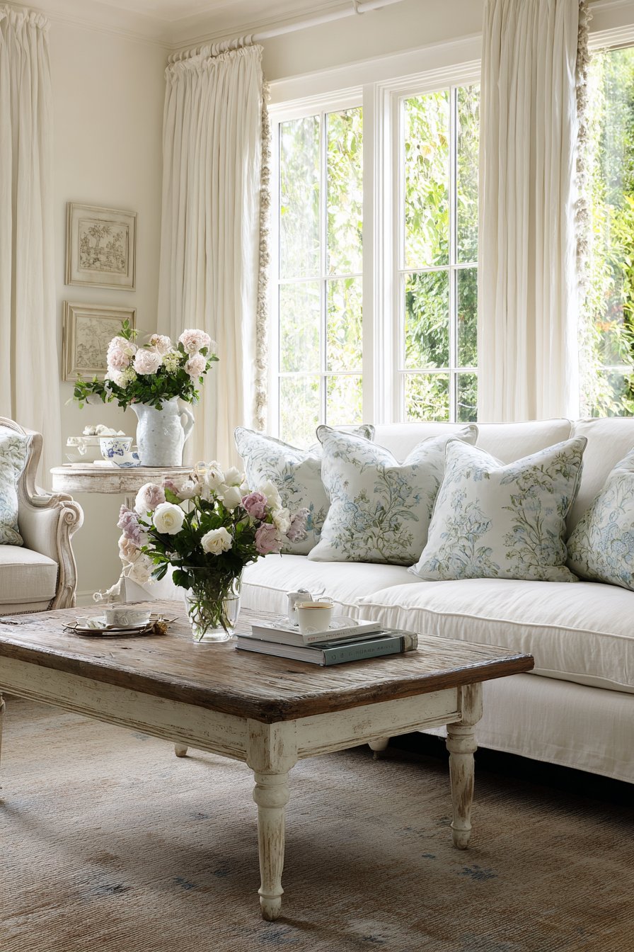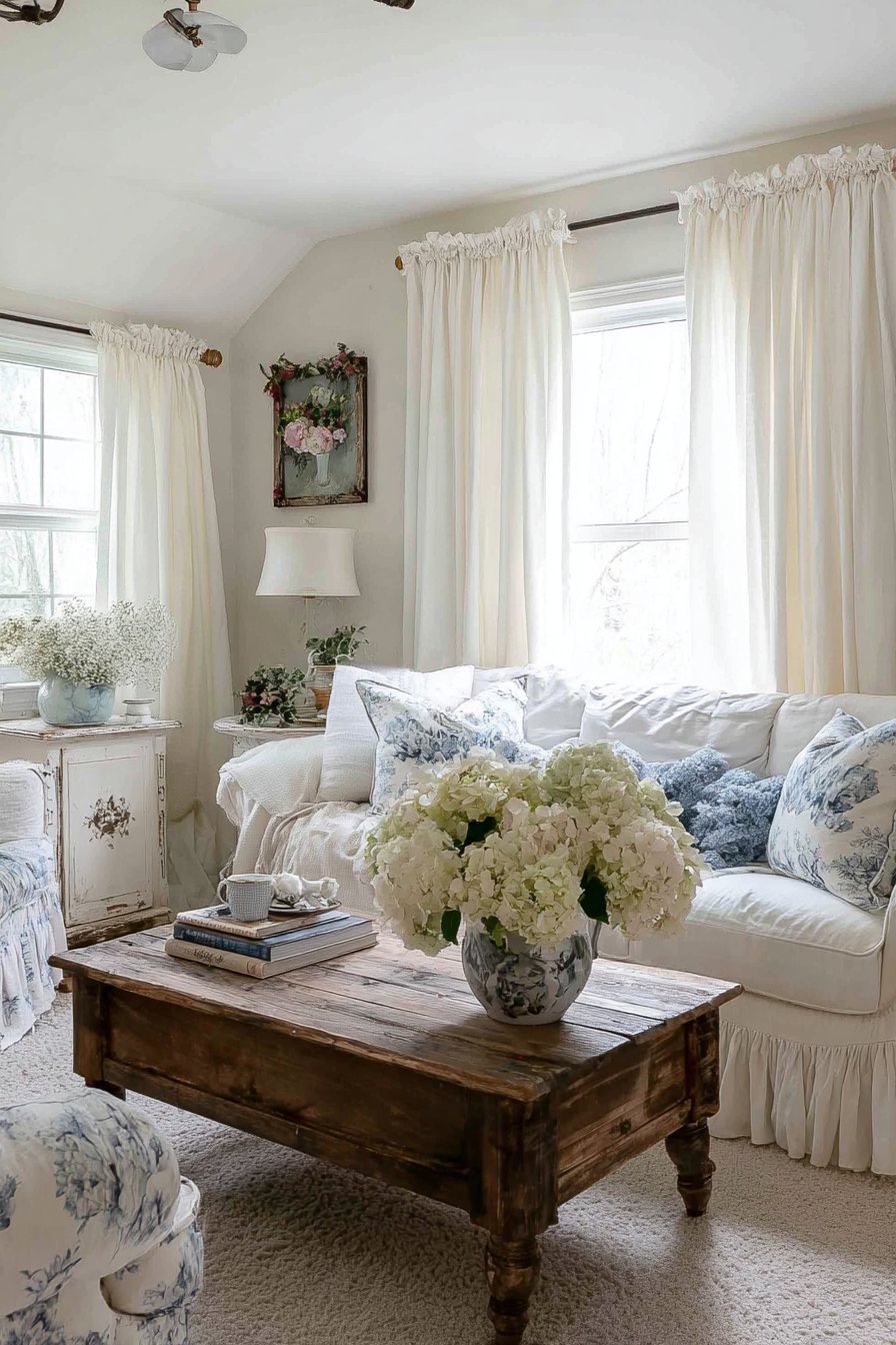 Soft morning light filtering through the gathered white curtains creates the luminous quality essential to French country interiors. The cottage-style aesthetic depends on this gentle illumination, which makes white walls glow warmly and highlights the texture in fabrics and aged wood surfaces. The ruffled curtains diffuse direct sunlight, preventing harsh shadows while maintaining brightness. This quality of light transforms throughout the day, creating ever-changing patterns and highlights that keep the space feeling alive and dynamic despite its traditional foundations.